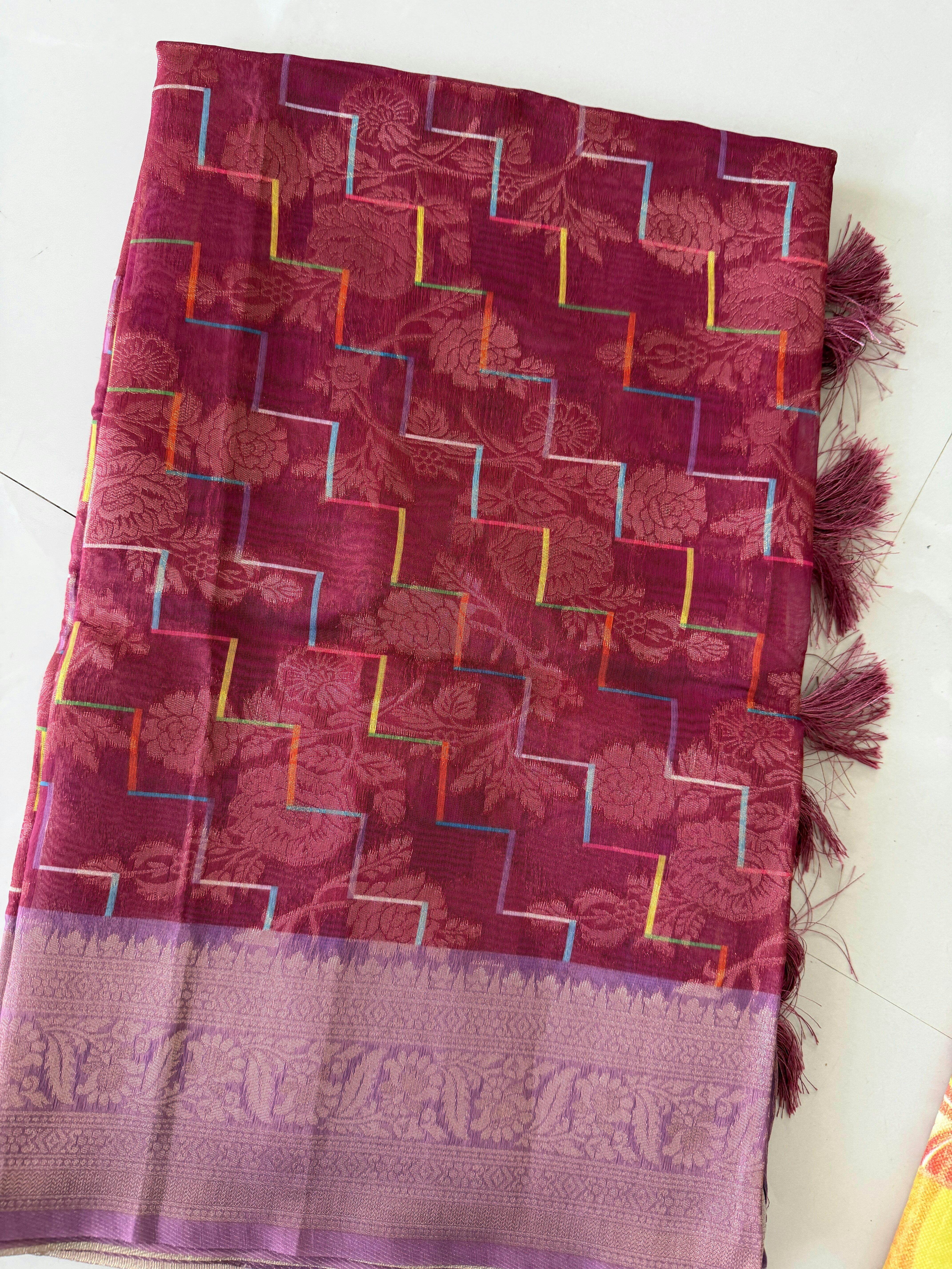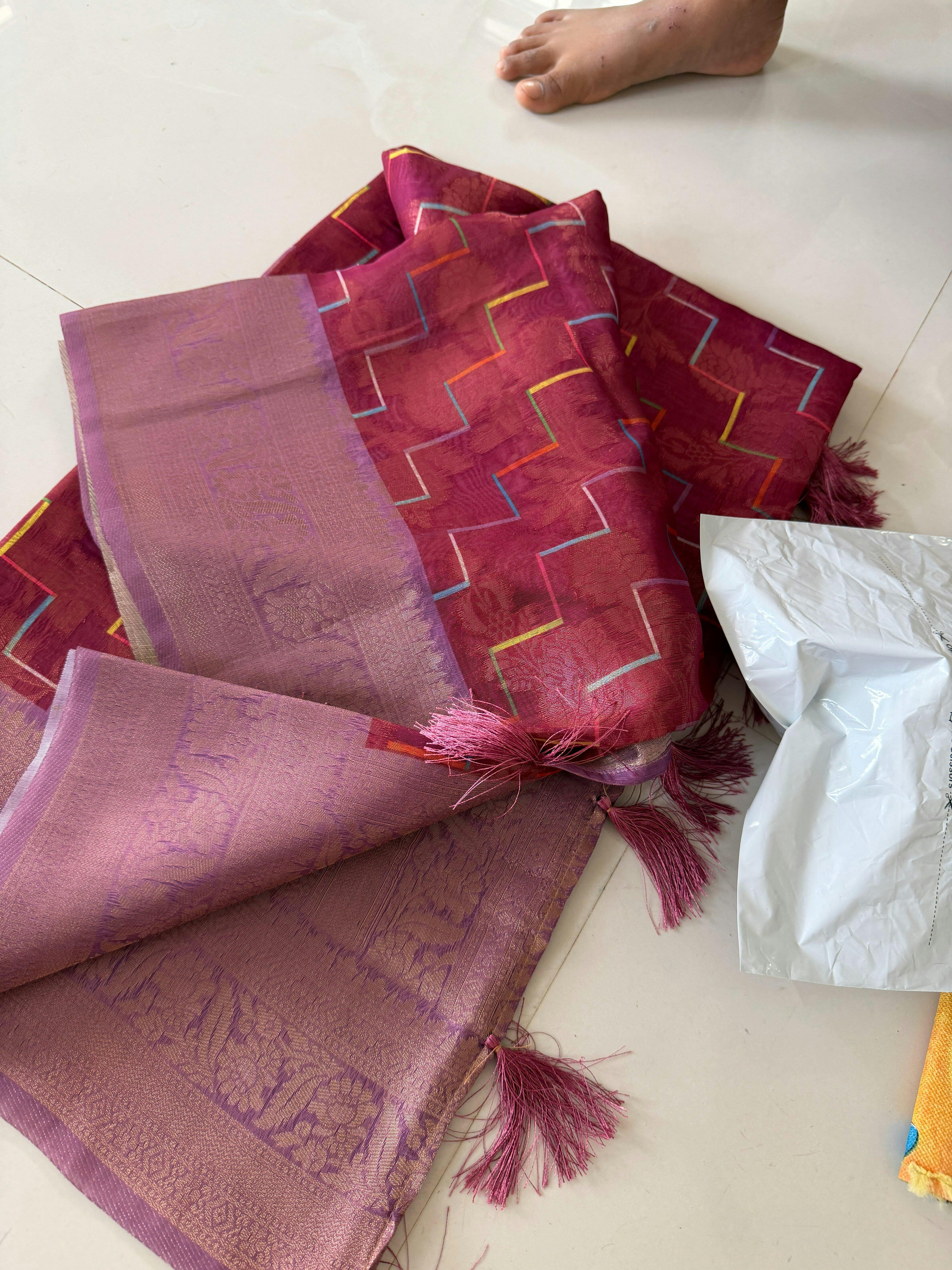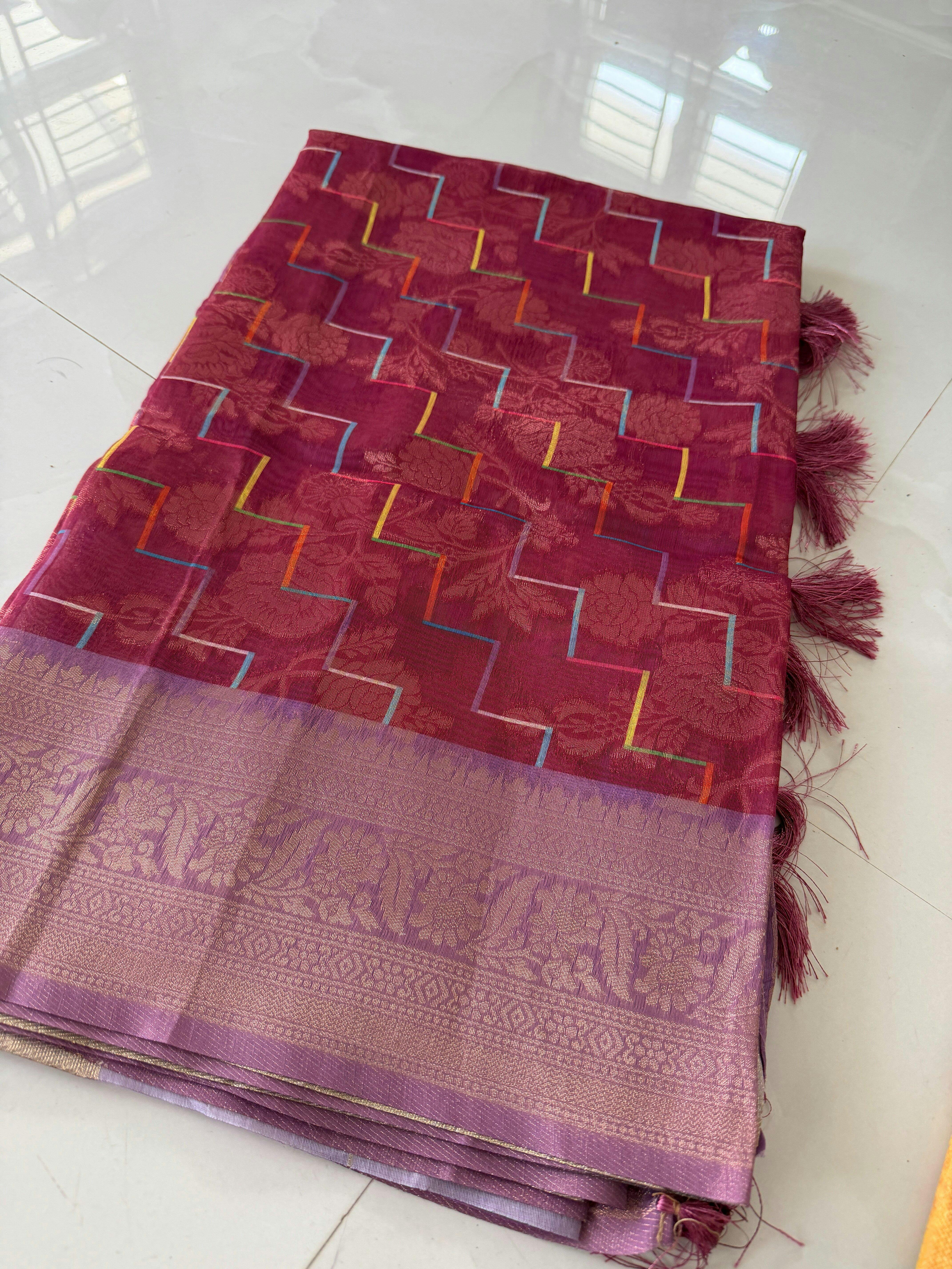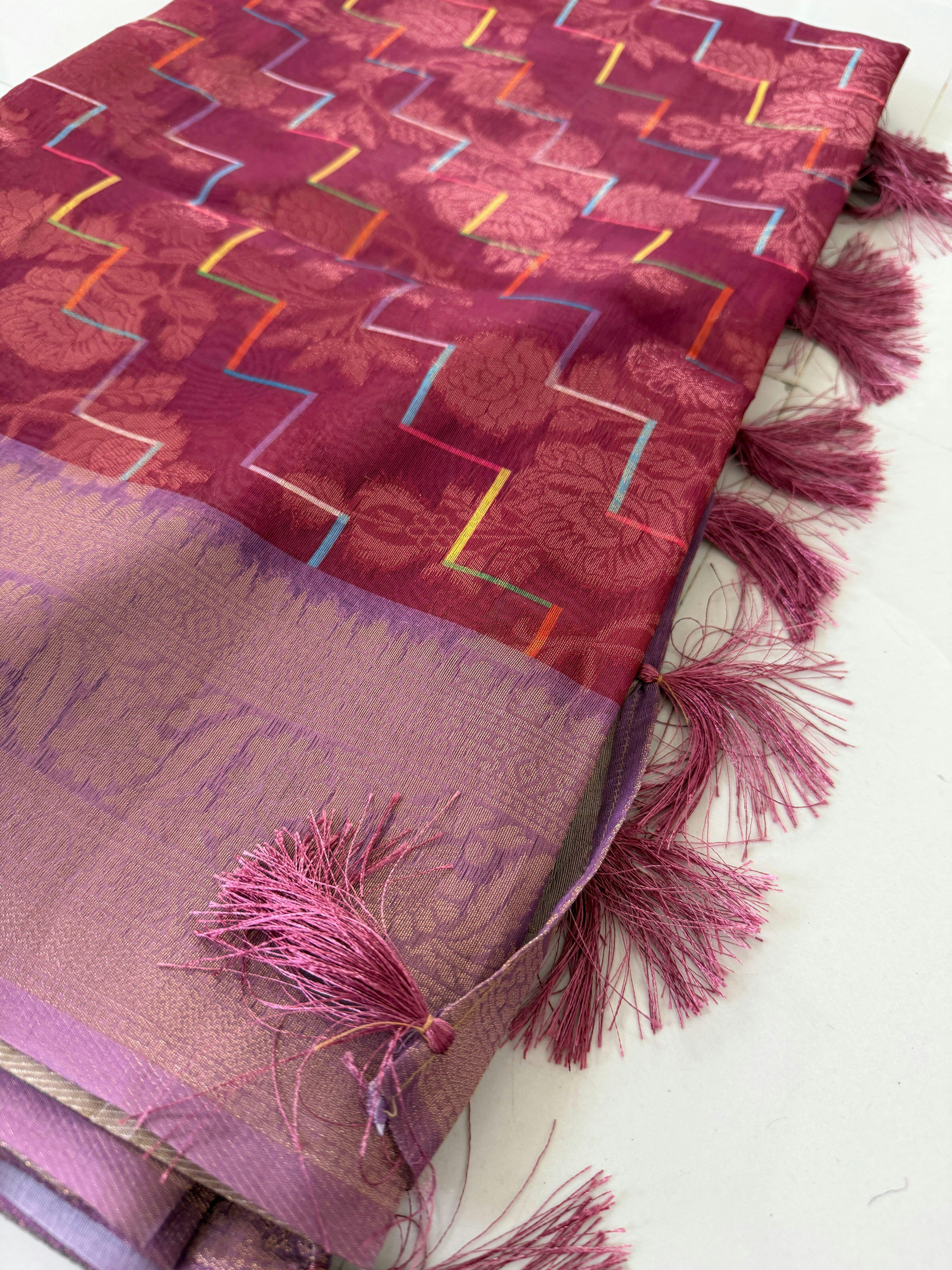 ✨ Banarasi Linen in Fuschia Pink + Lavender - Vibrant Chevron Stripes | Menmai Exclusive Saree 👑