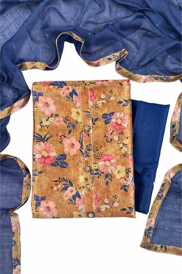 Unstitched Salwar Set - Asam silk | Sepia Tan Brown + Blue