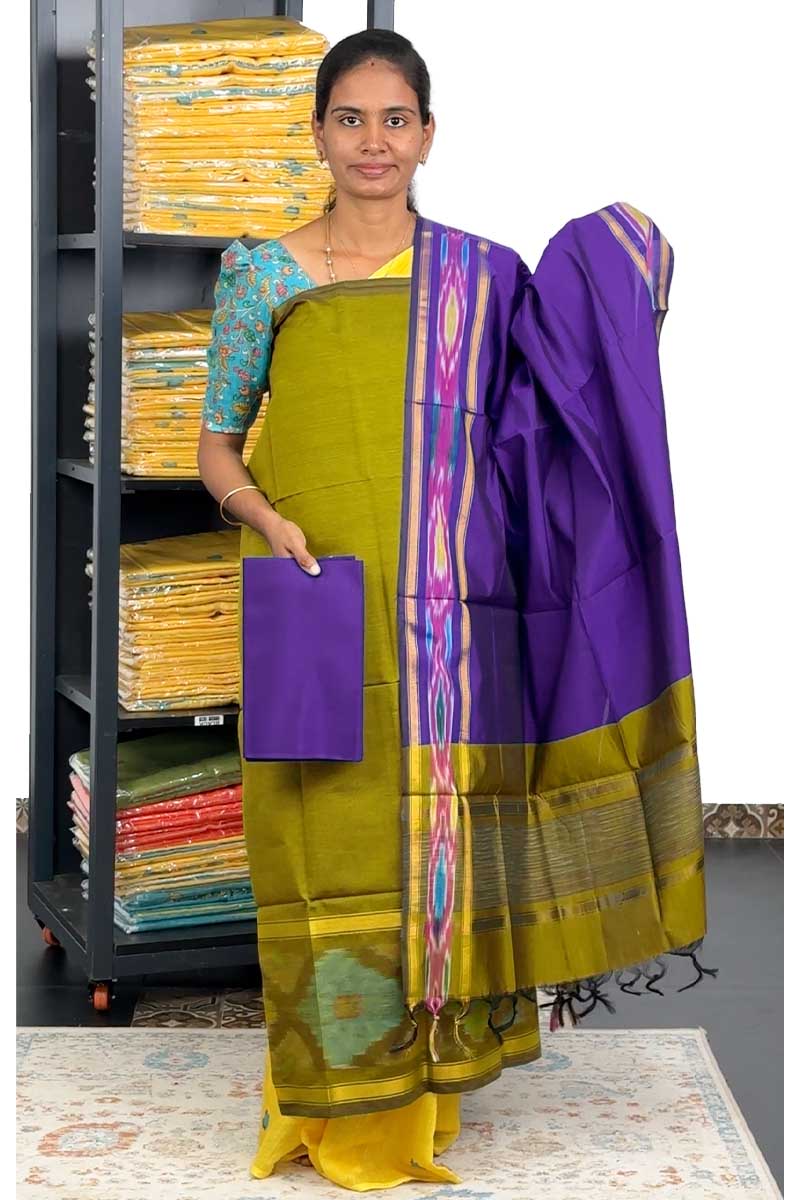 Unstitched Salwar Set - Pochampally silk | Army green + Violet