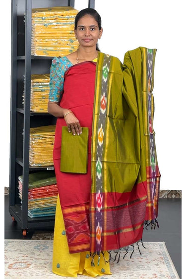 Unstitched Salwar Set - Pochampally silk | Red + Olive Green