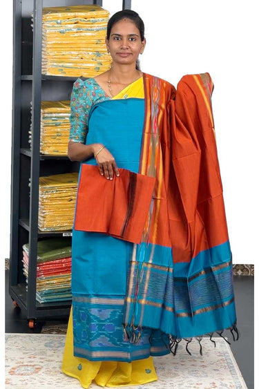 Unstitched Salwar Set - Pochampally silk | Happy Blue + Rustic Orange
