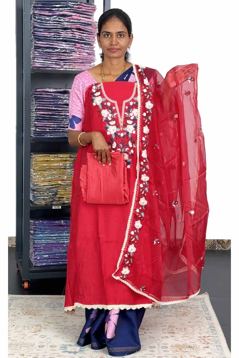 Unstitched Salwar Set - Roman Silk | Embroidery Flowers Design | Pretty Red