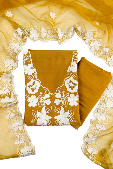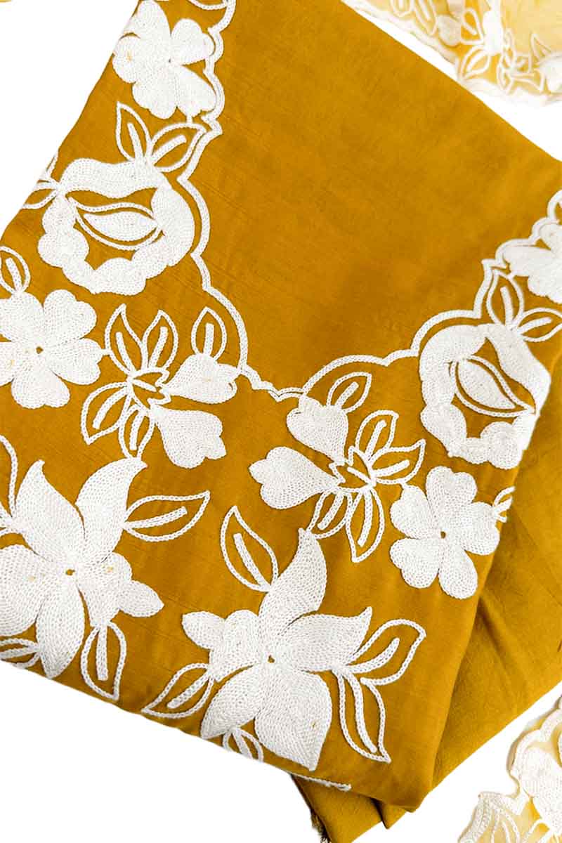 Unstitched Salwar Set - Roman Silk | Embroidery Flowers Design | Dark Mustard Yellow