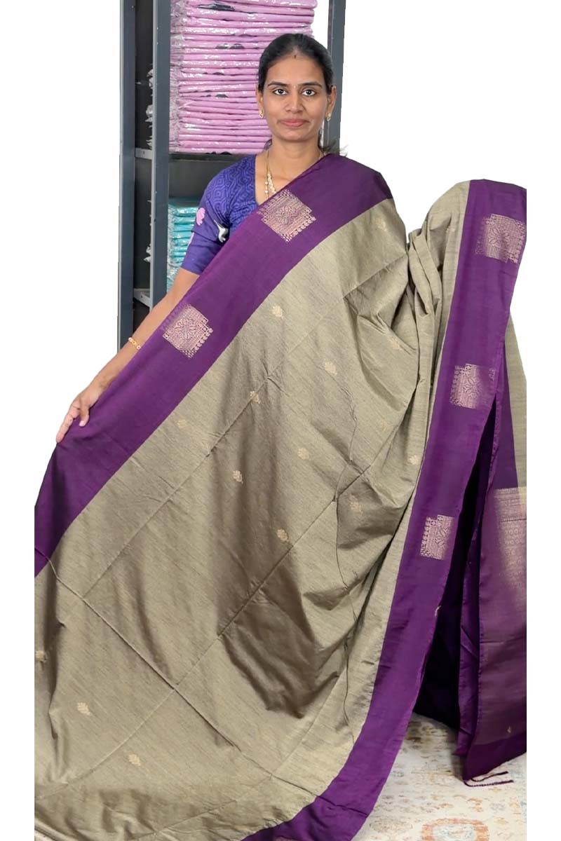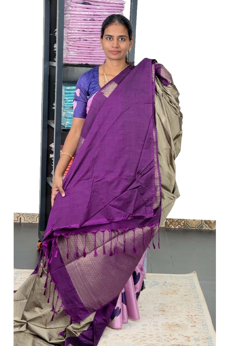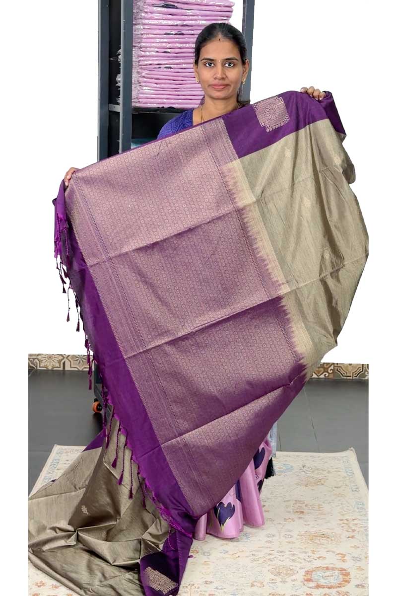 Jute Silk Mix Saree With Fancy Border | Soft Taupe + Eggplant