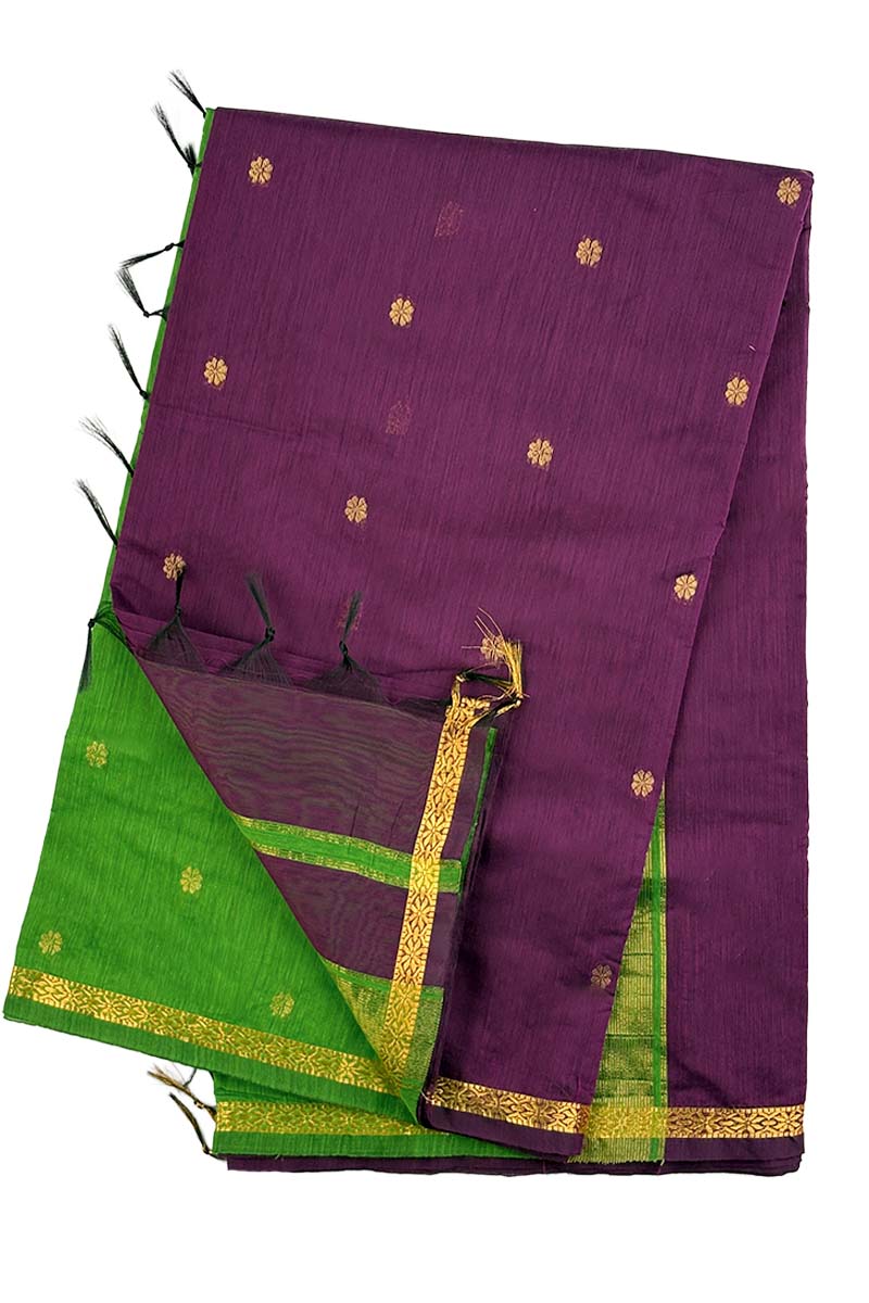 Maheswari Cotton with Small Butta | Eggplant Purple + Green Grass