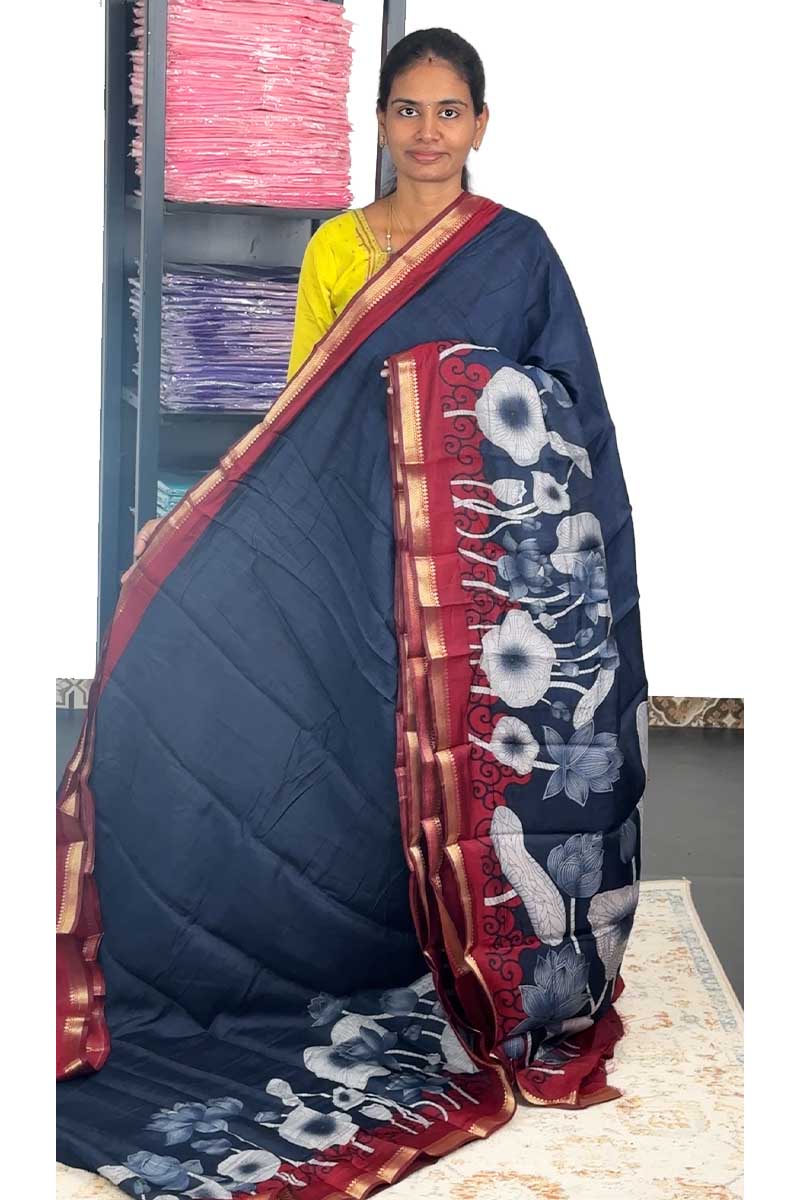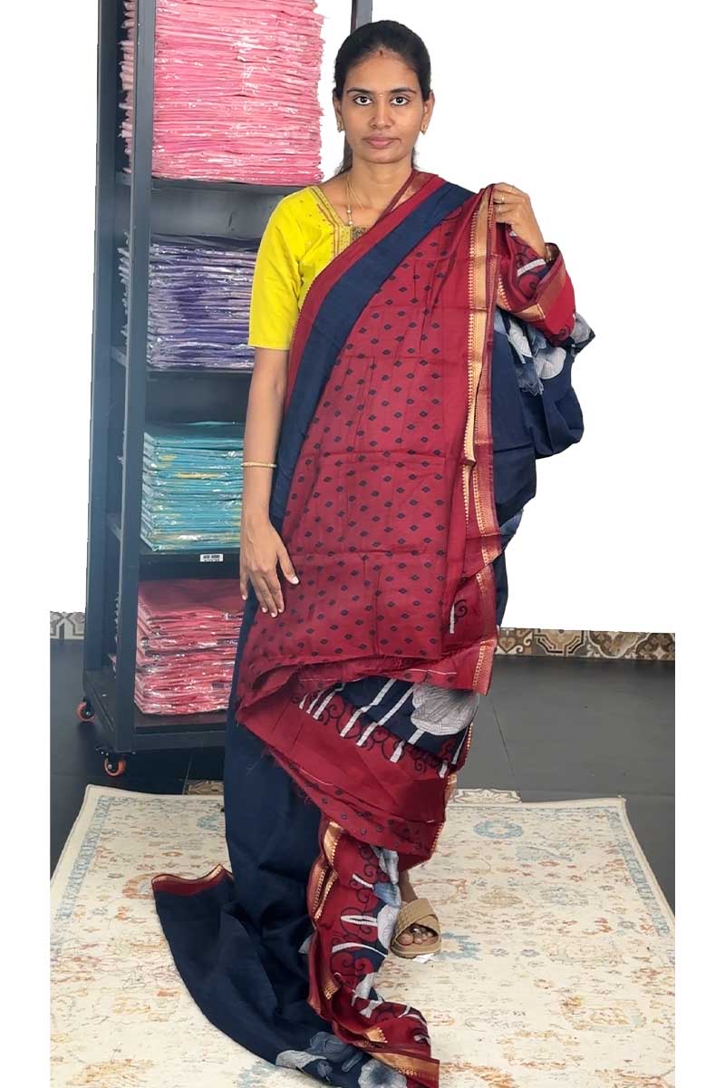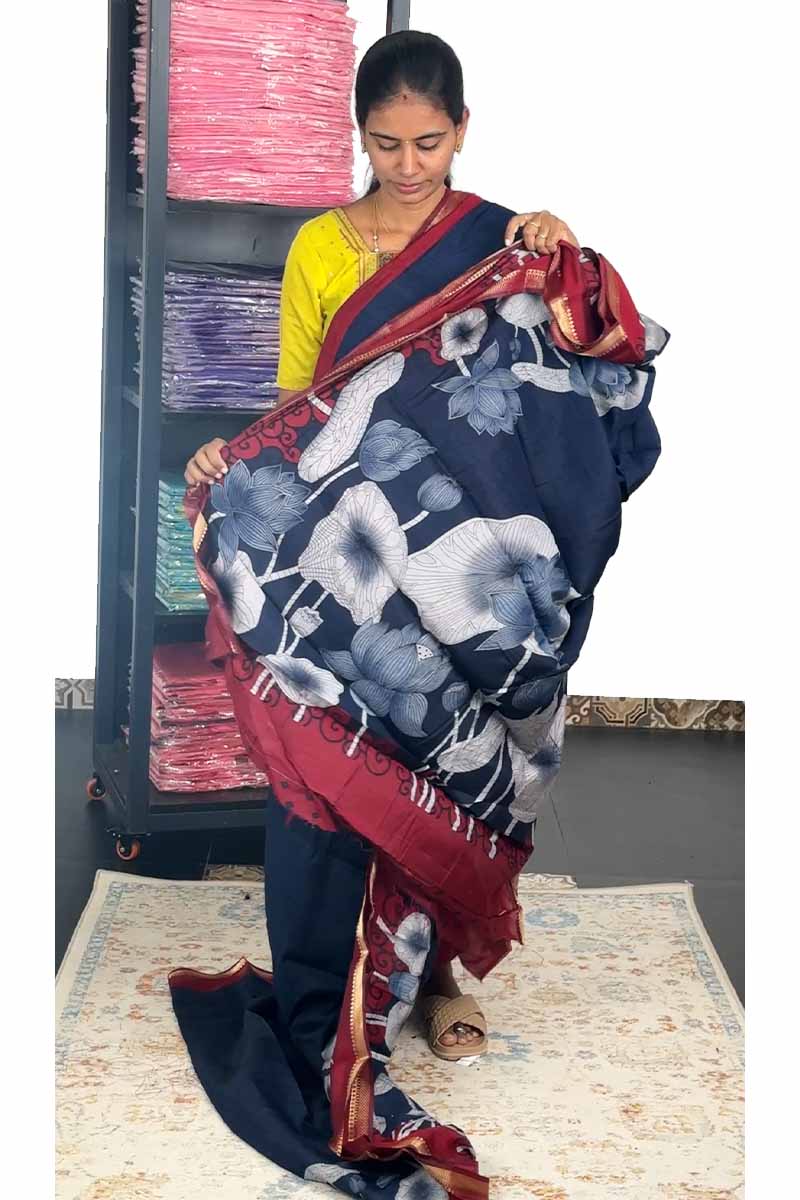 Semi Maheswari Cotton with Pichwai Design | Navy Blue + Maroon