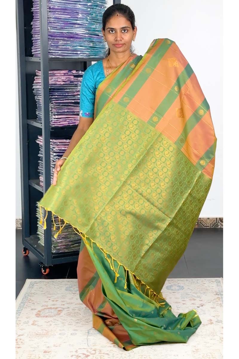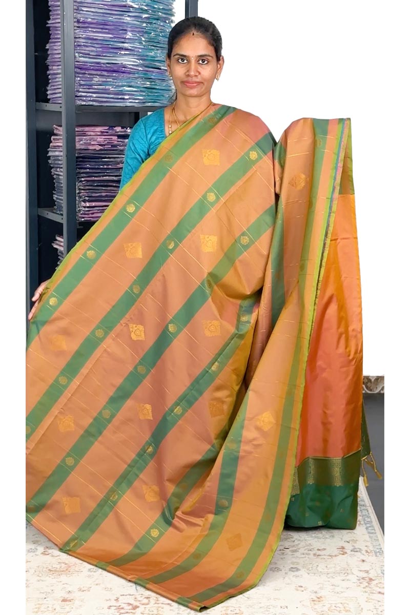 Semi Soft Silk Saree without boarder | Burnt Orange + Emerald