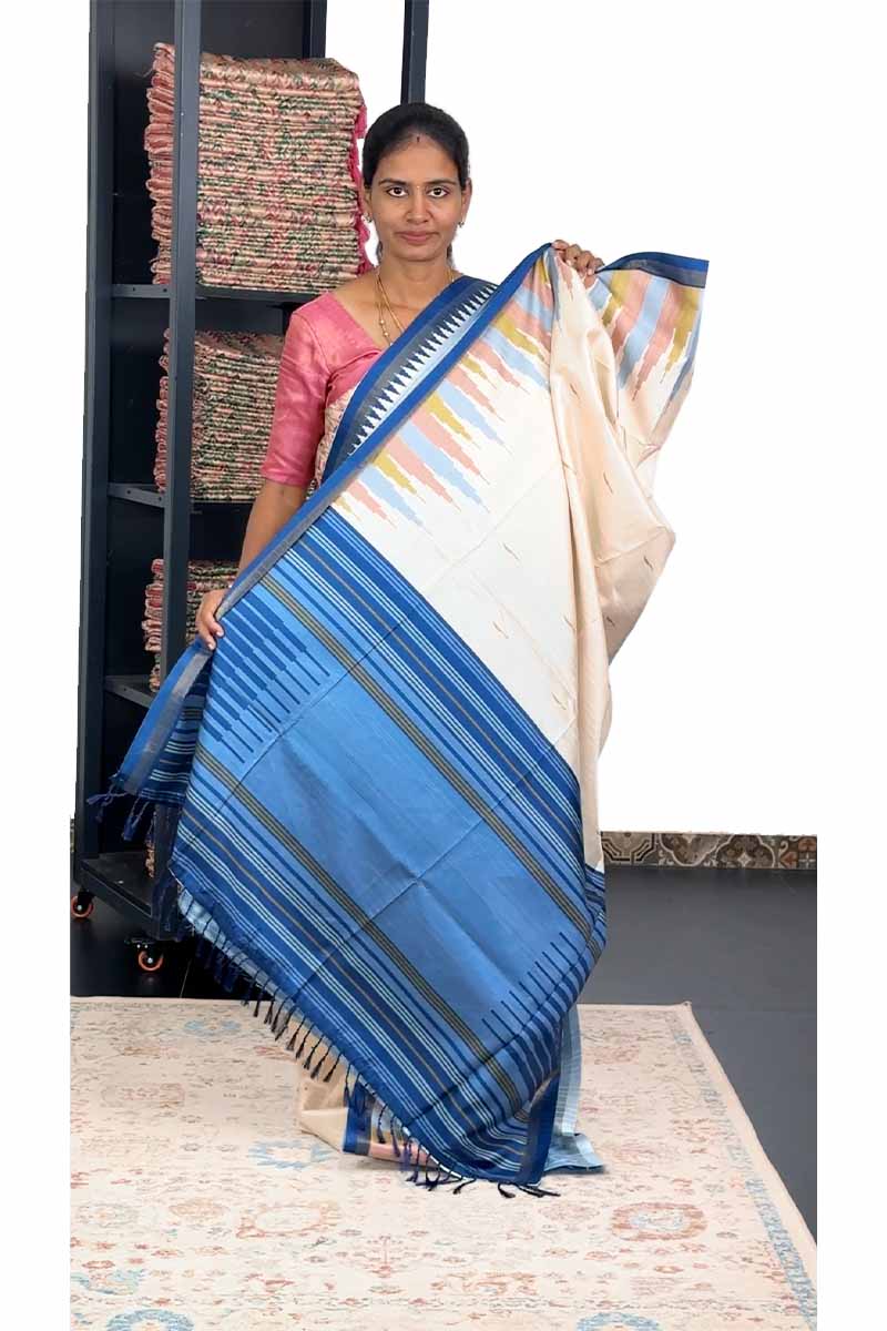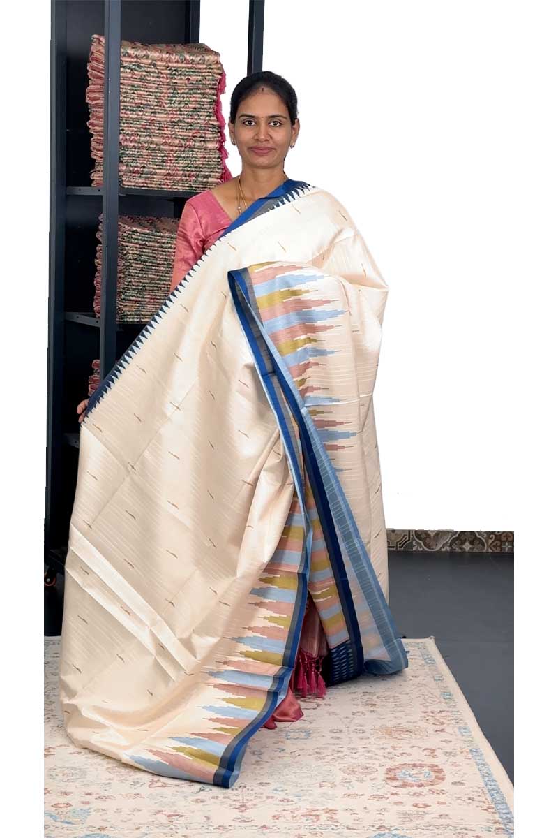 Semi Tussar Saree with Temple Border |Ivory and Royal Blue