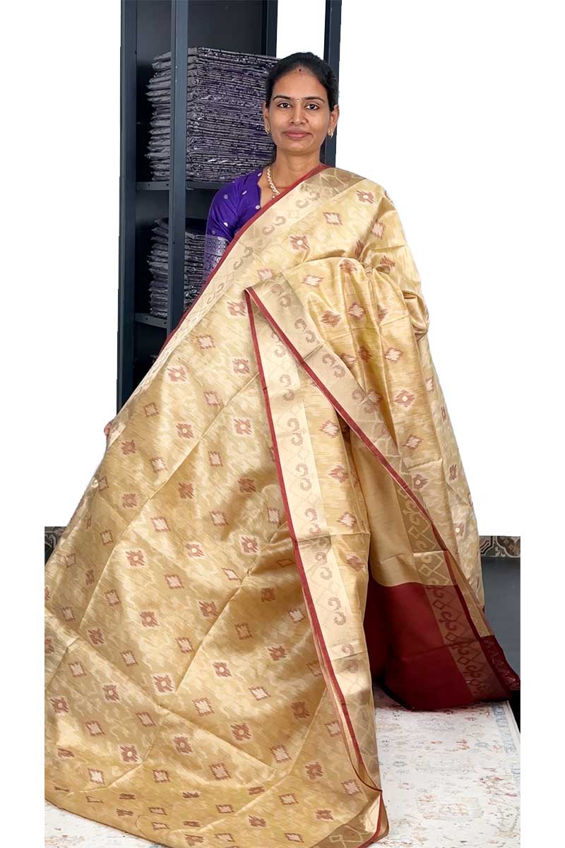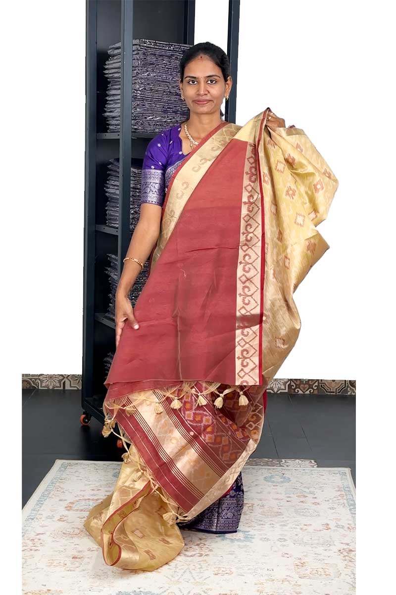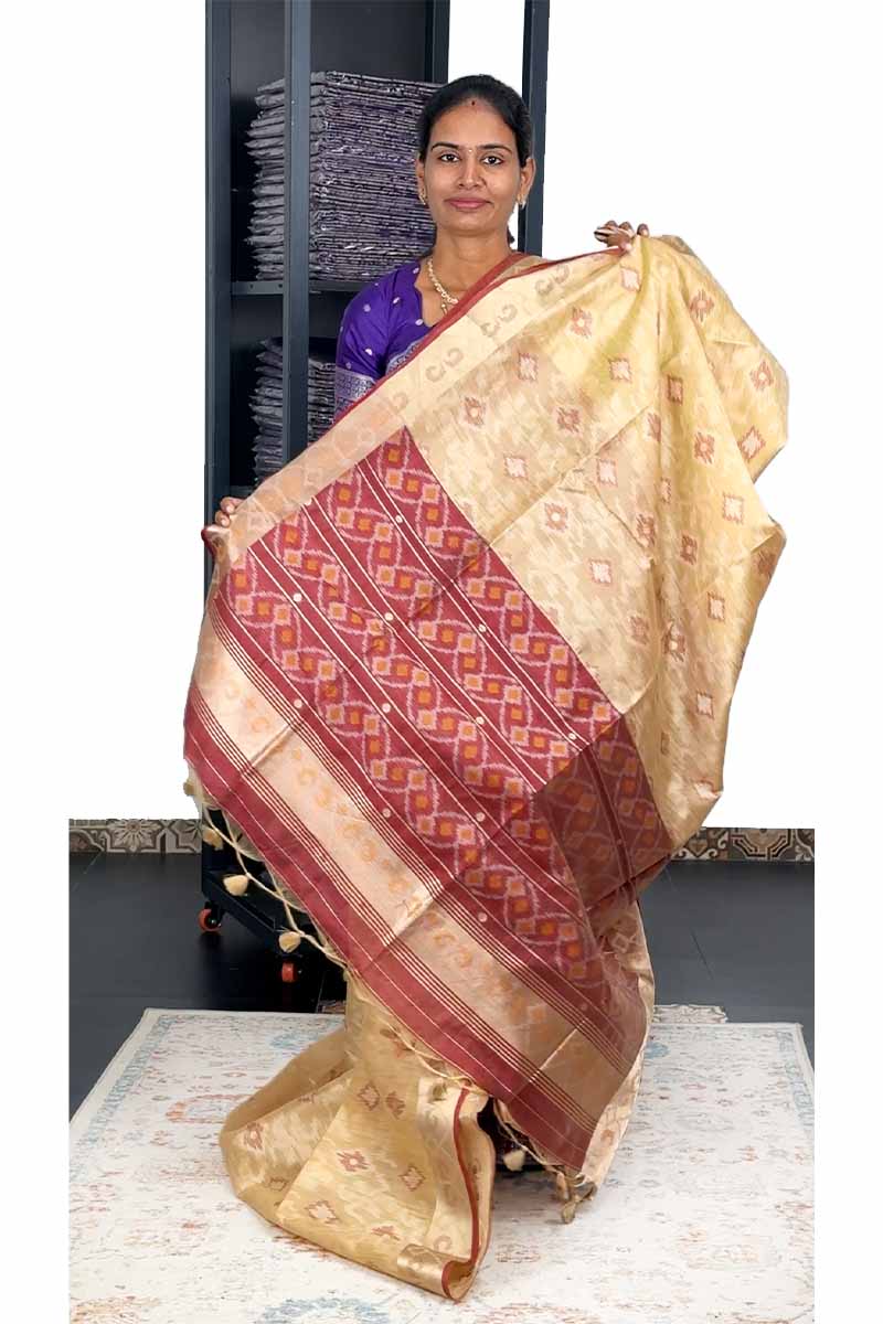 Patola Silk Saree With IKkat weaving | Tan White + Maroon