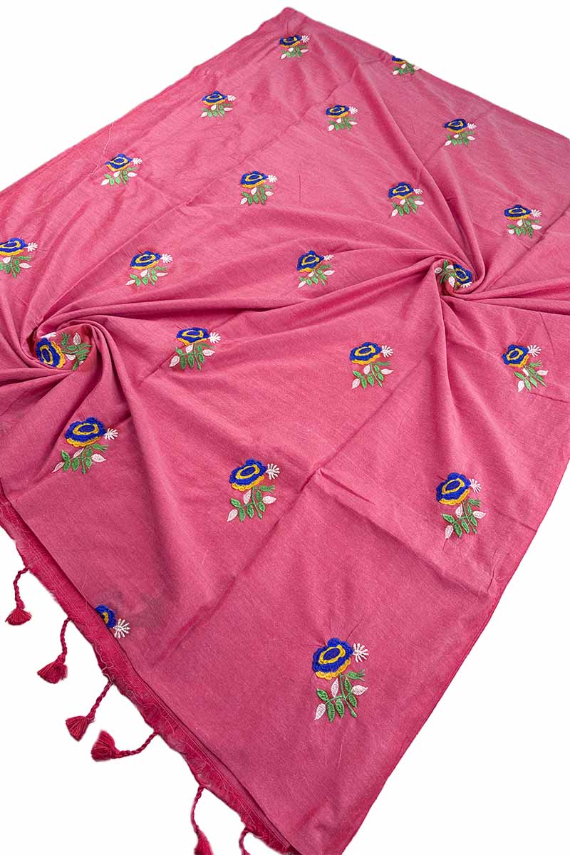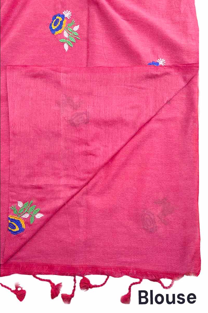 Khadi Cotton Saree With Rose Embroidery Design | Hot Pink