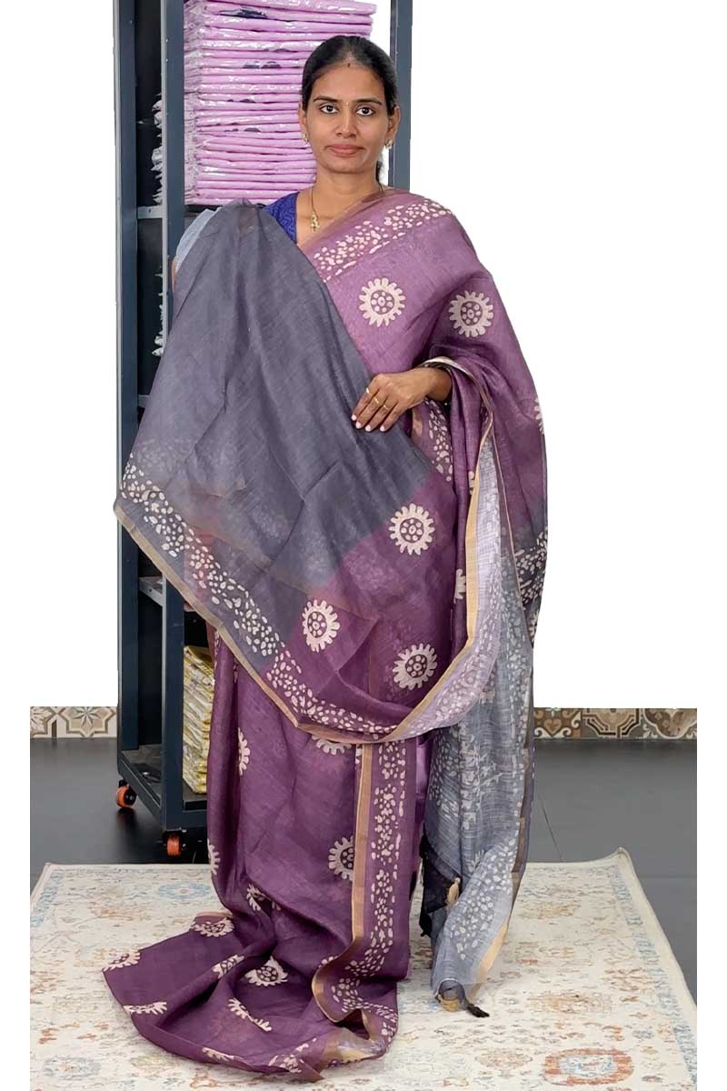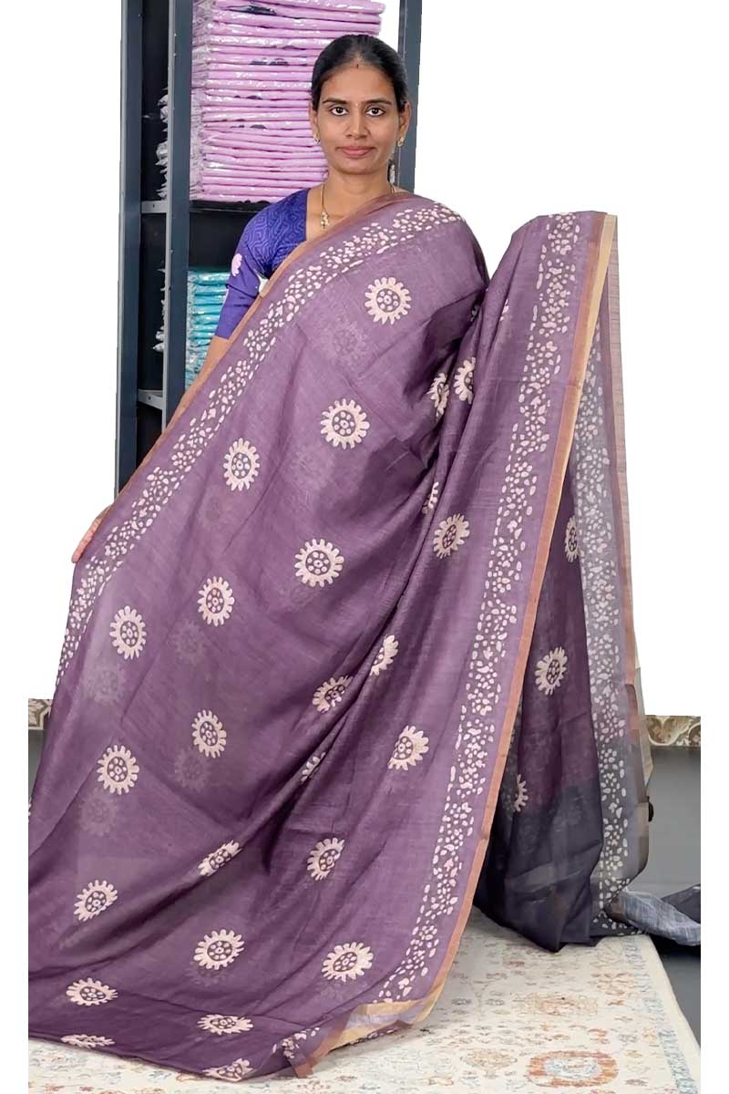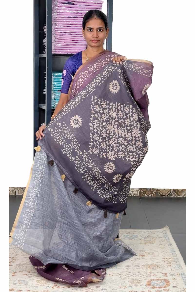 Linen Cotton Saree With Batik Design | Light Eggplant