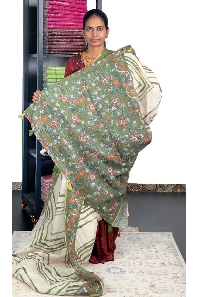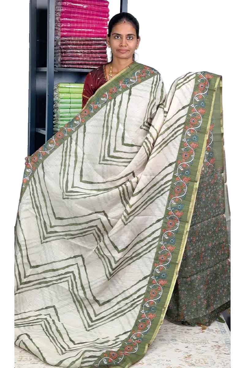 Linen Cotton Saree With Leheriya Pattern | Off White + Green
