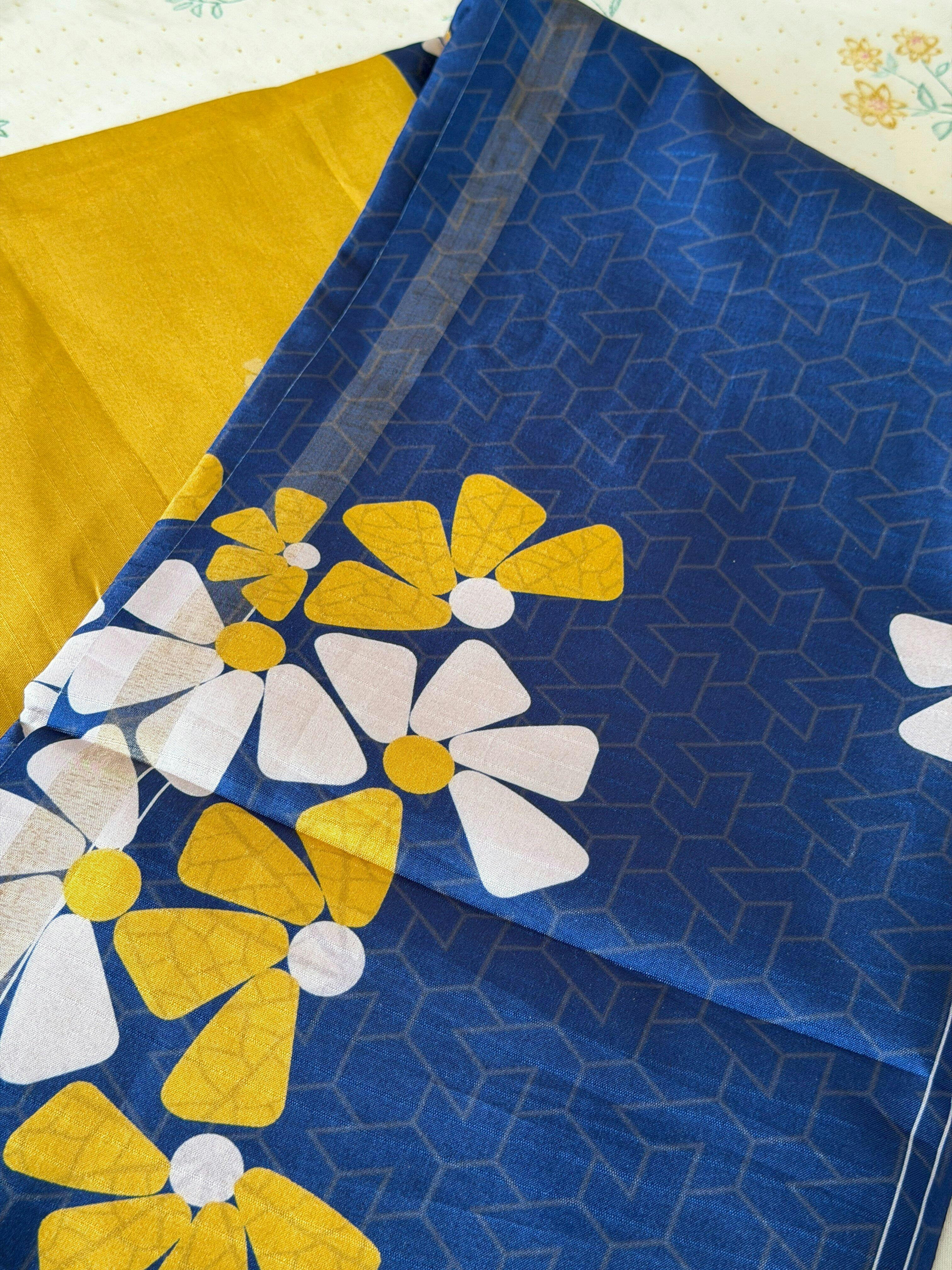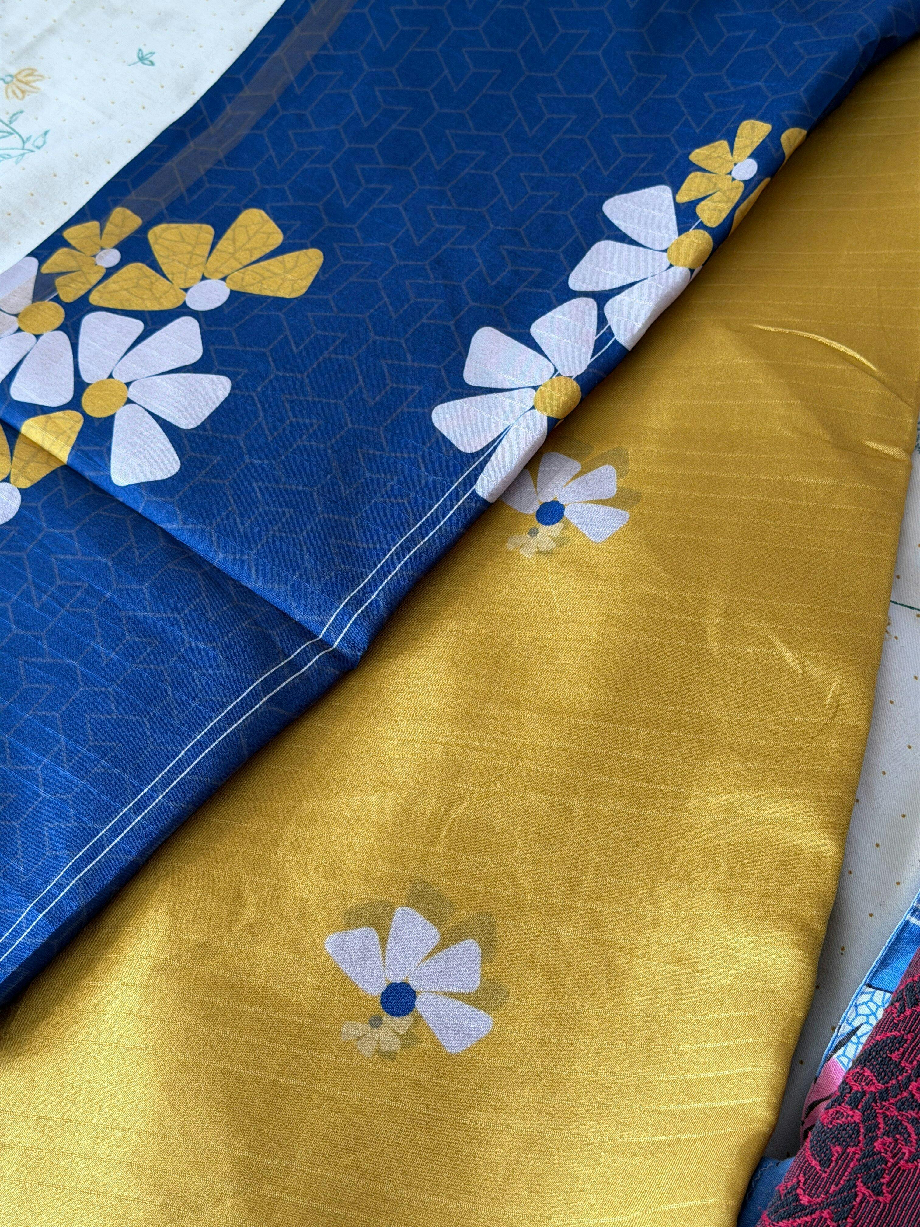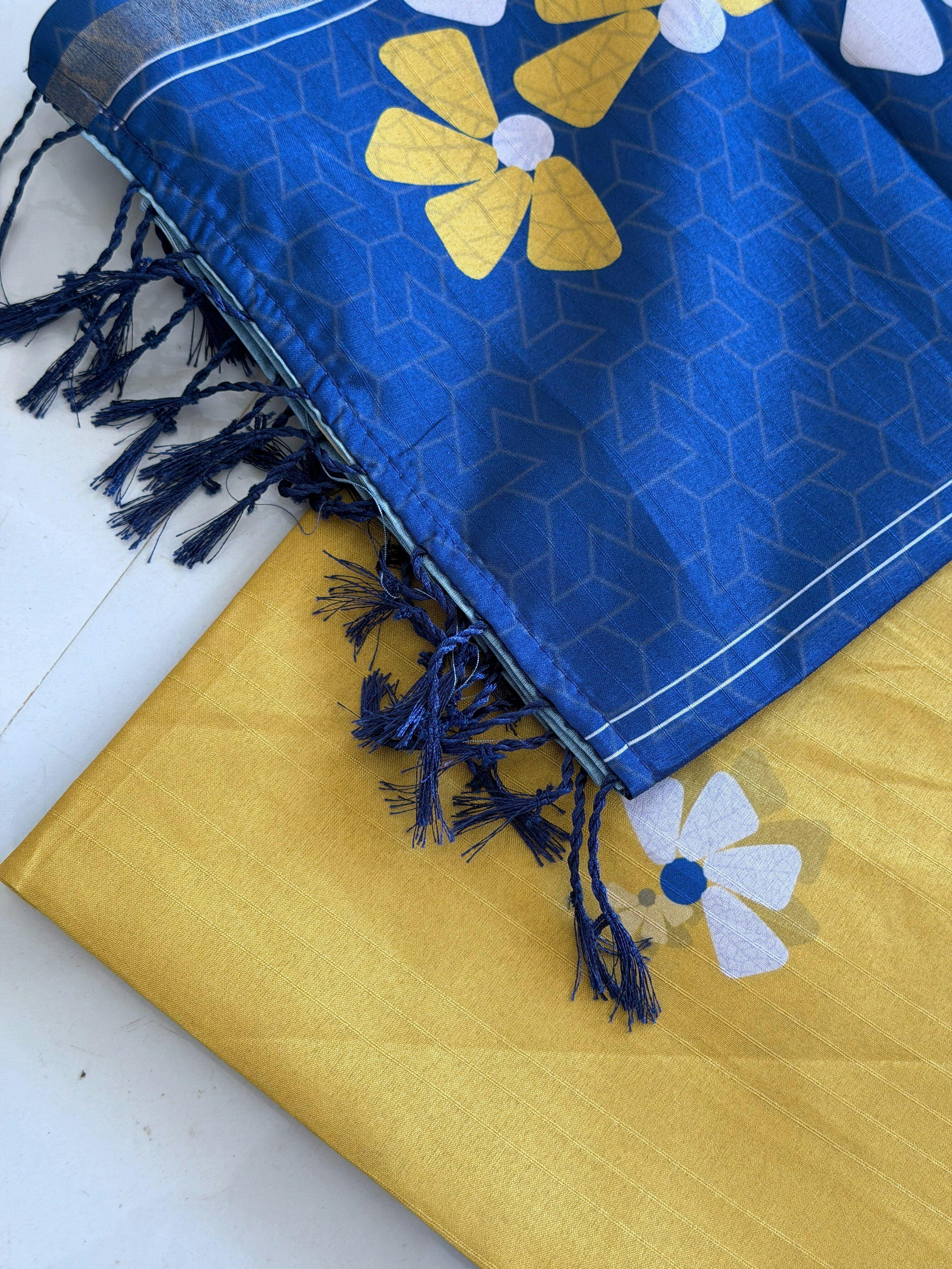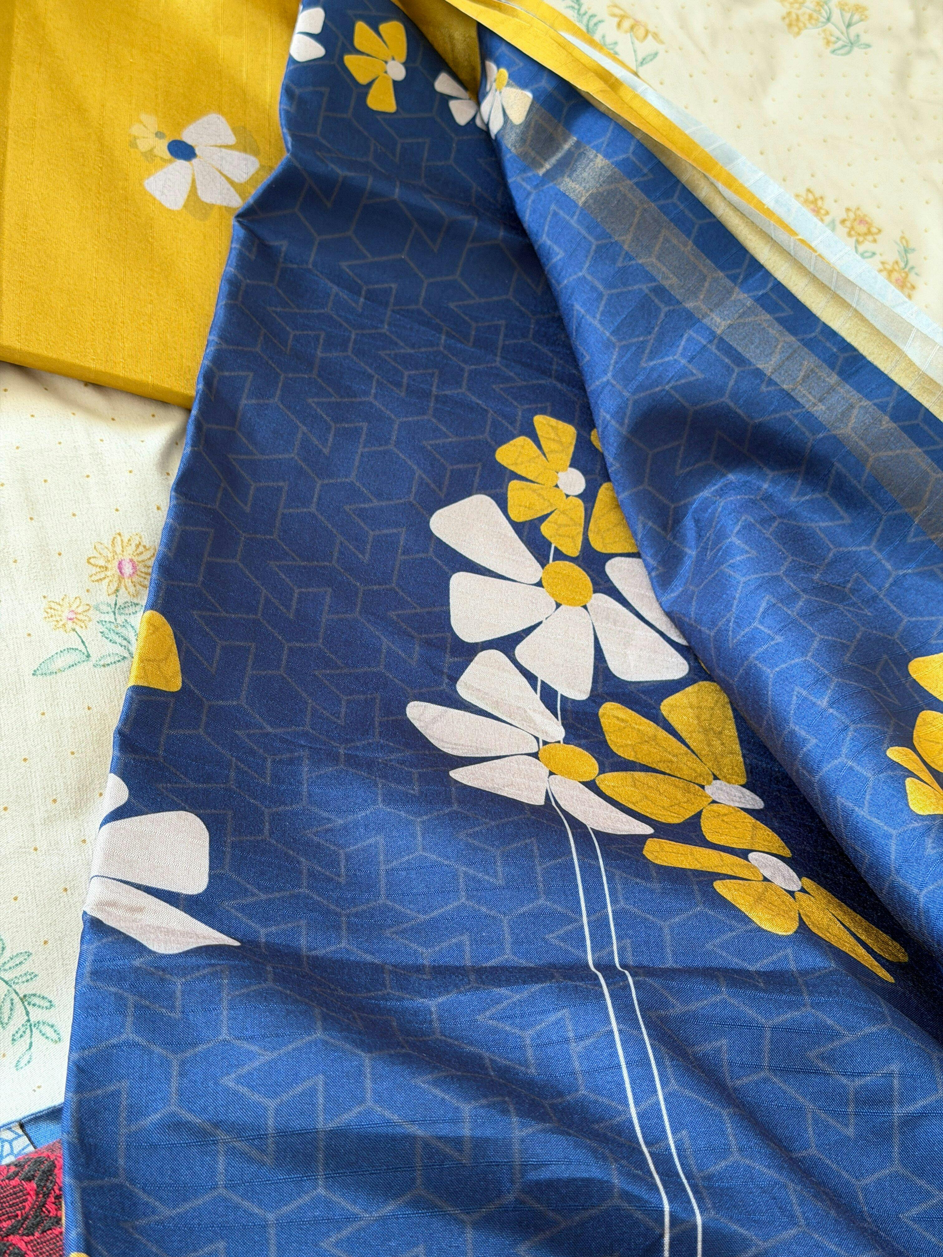 🌟3D Flower Soft Semi Tussar Silk Saree | Menmai Exclusive 👑 | Golden Turmeric + Midnight Blue
