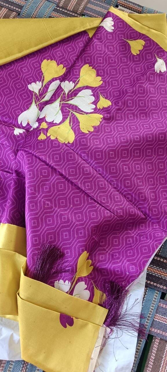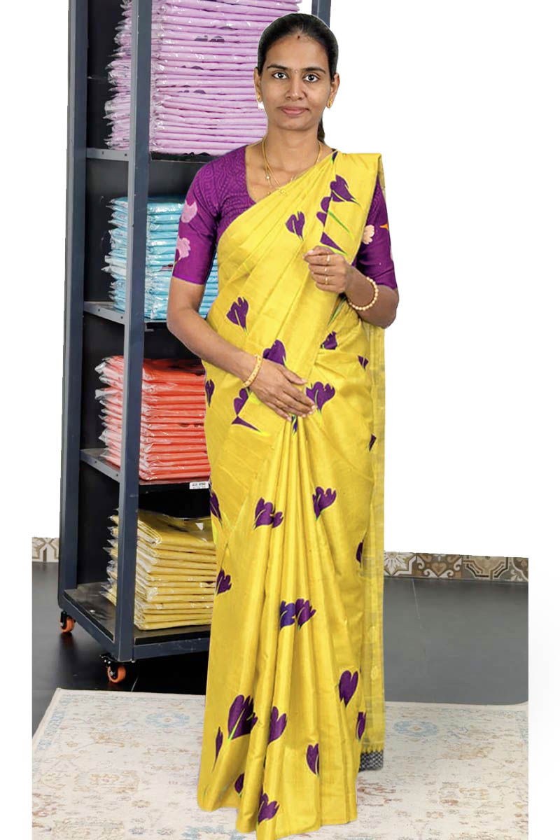Air Tussar Saree With Flower Motif | Sunny yellow+Orchid Purple