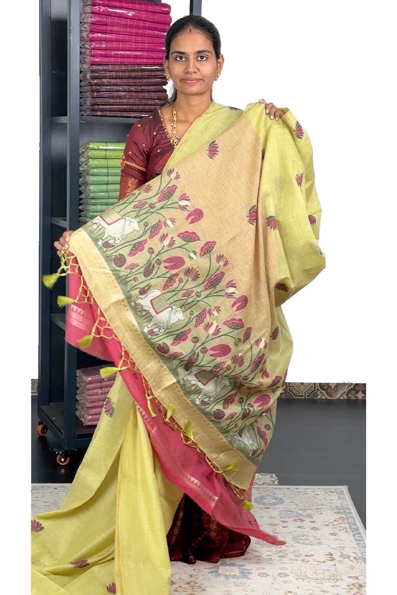 Munga Cotton Saree With Lotus Embroidery |Pear Green