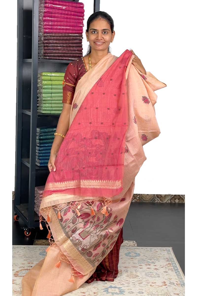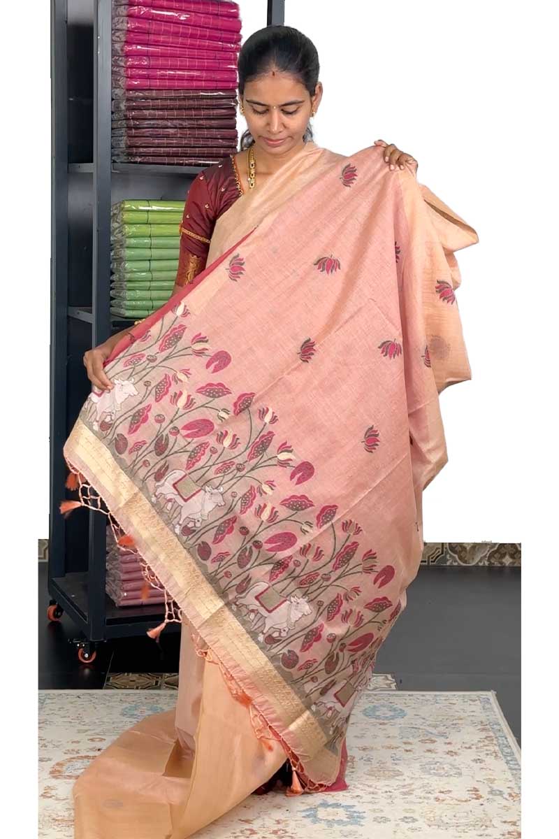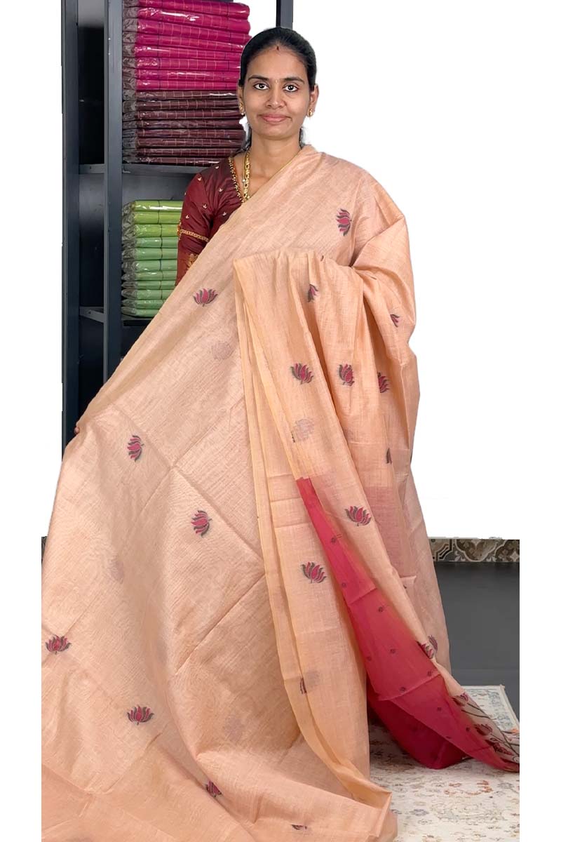 Munga Cotton Saree With Lotus Embroidery |Peach