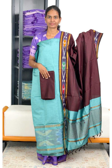 Pochampally Silk Salwar Material (Top, Bottom & Dupatta) - Ice Blue + Deep Brown