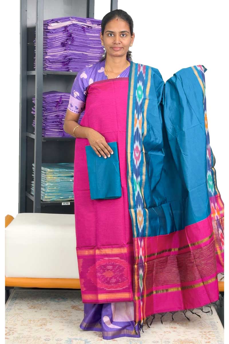 Pochampally Silk Salwar Material (Top, Bottom & Dupatta) - Hot Pink + Happy Blue