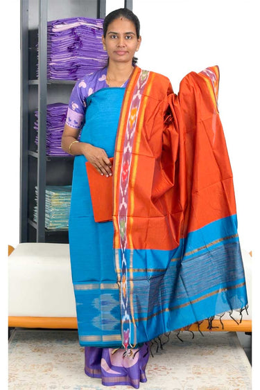 Pochampally Silk Salwar Material (Top, Bottom & Dupatta) - Happy blue + Pumpkin