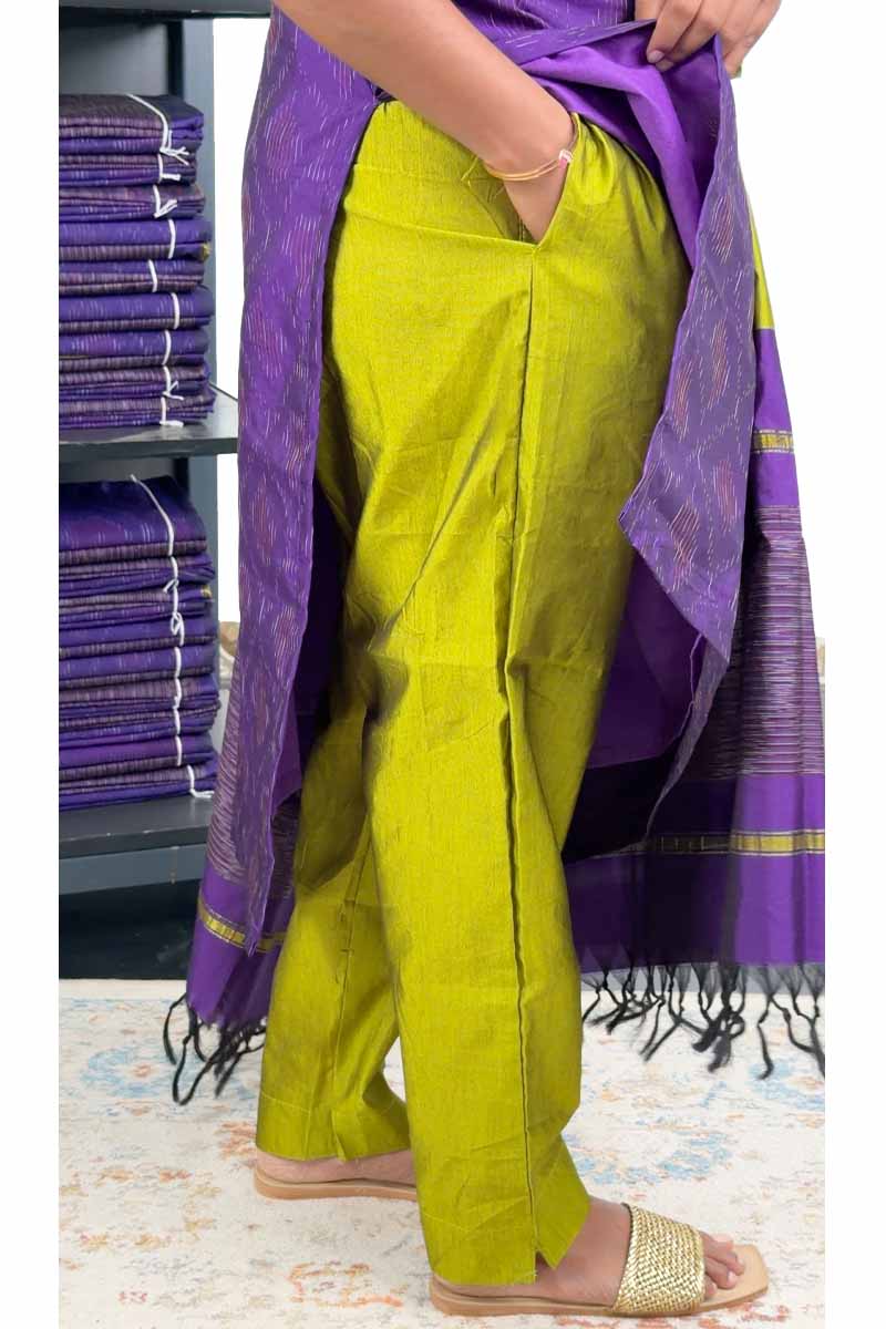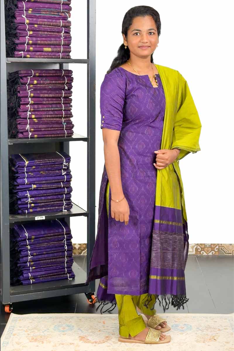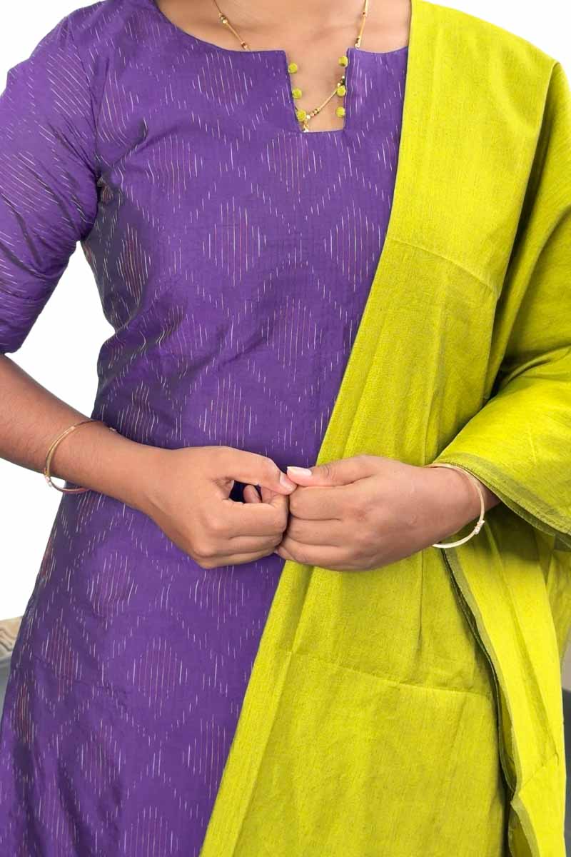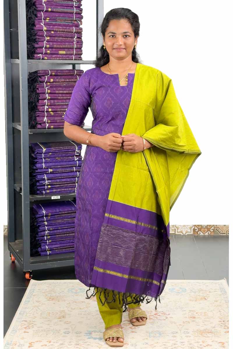 Pochampally Silk Stitched Salwar Suit (Top, Bottom & Dupatta) - Violet + Parrot Green