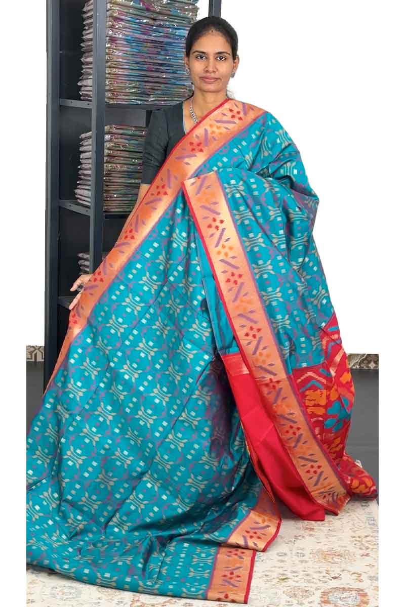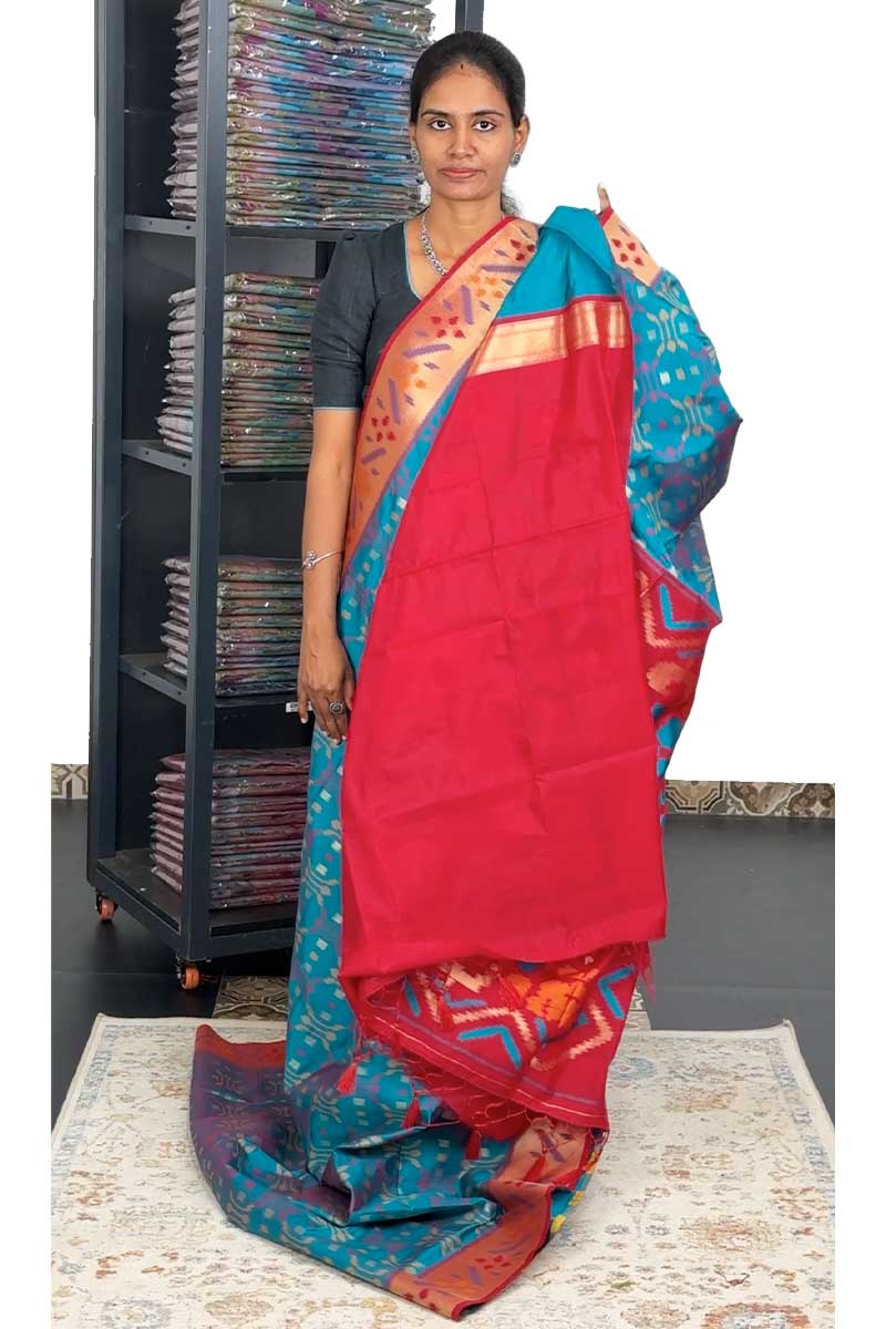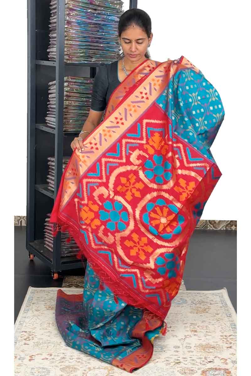Pochampally Soft Silk Saree With patola Pattern | Happy Blue + Red