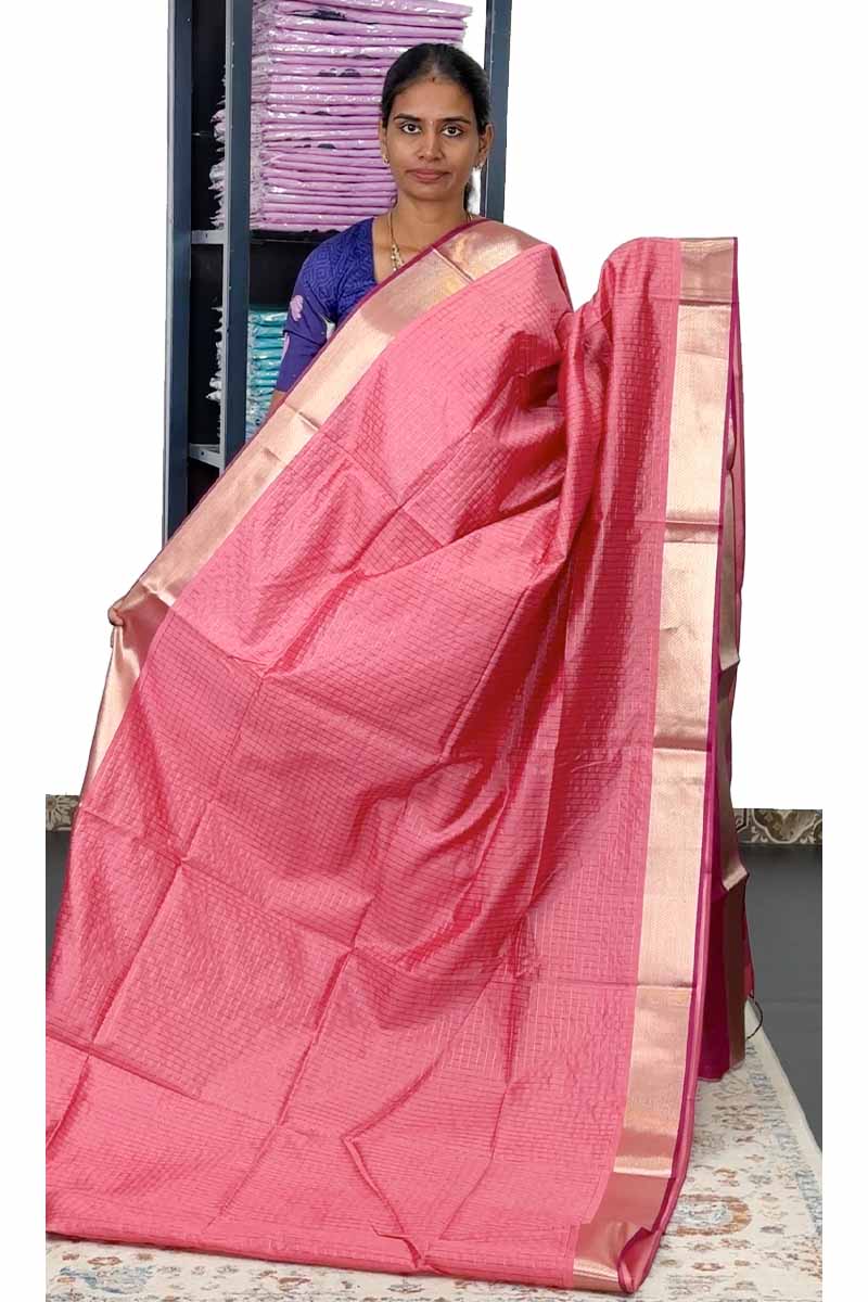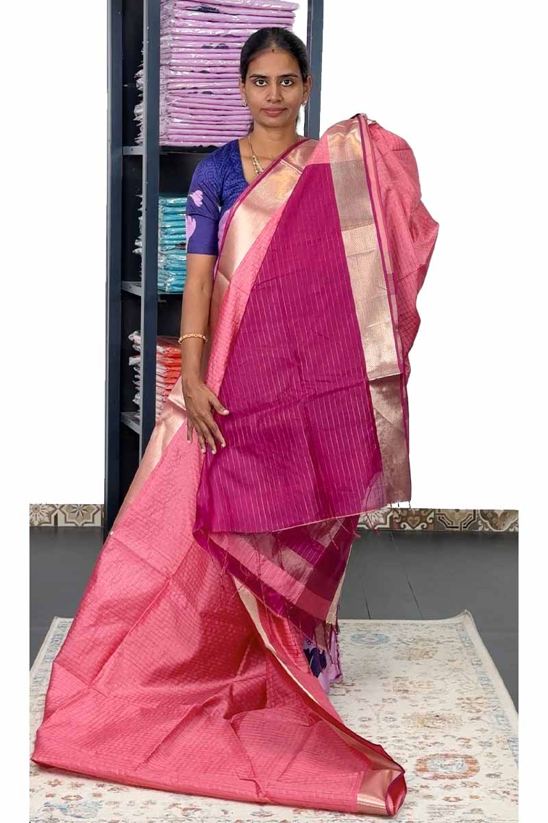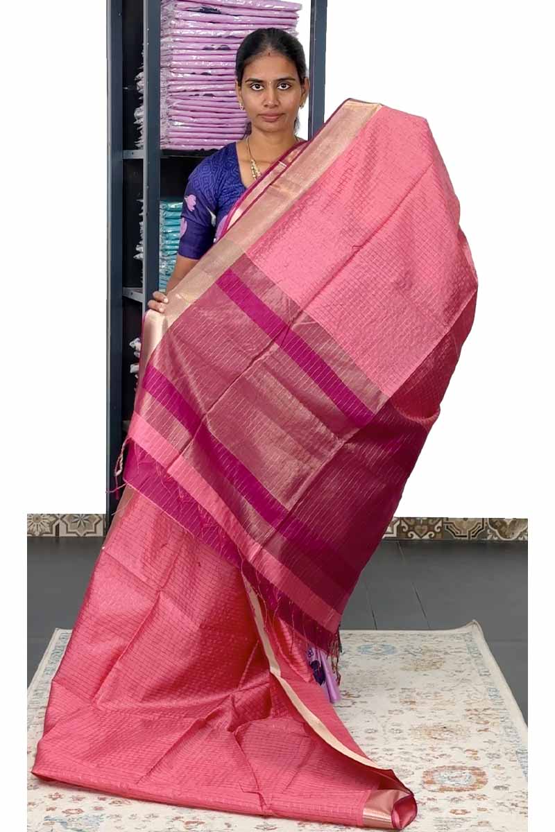Raw Silk Saree With Mini Chex | Mamey Pink + Orchid Purple