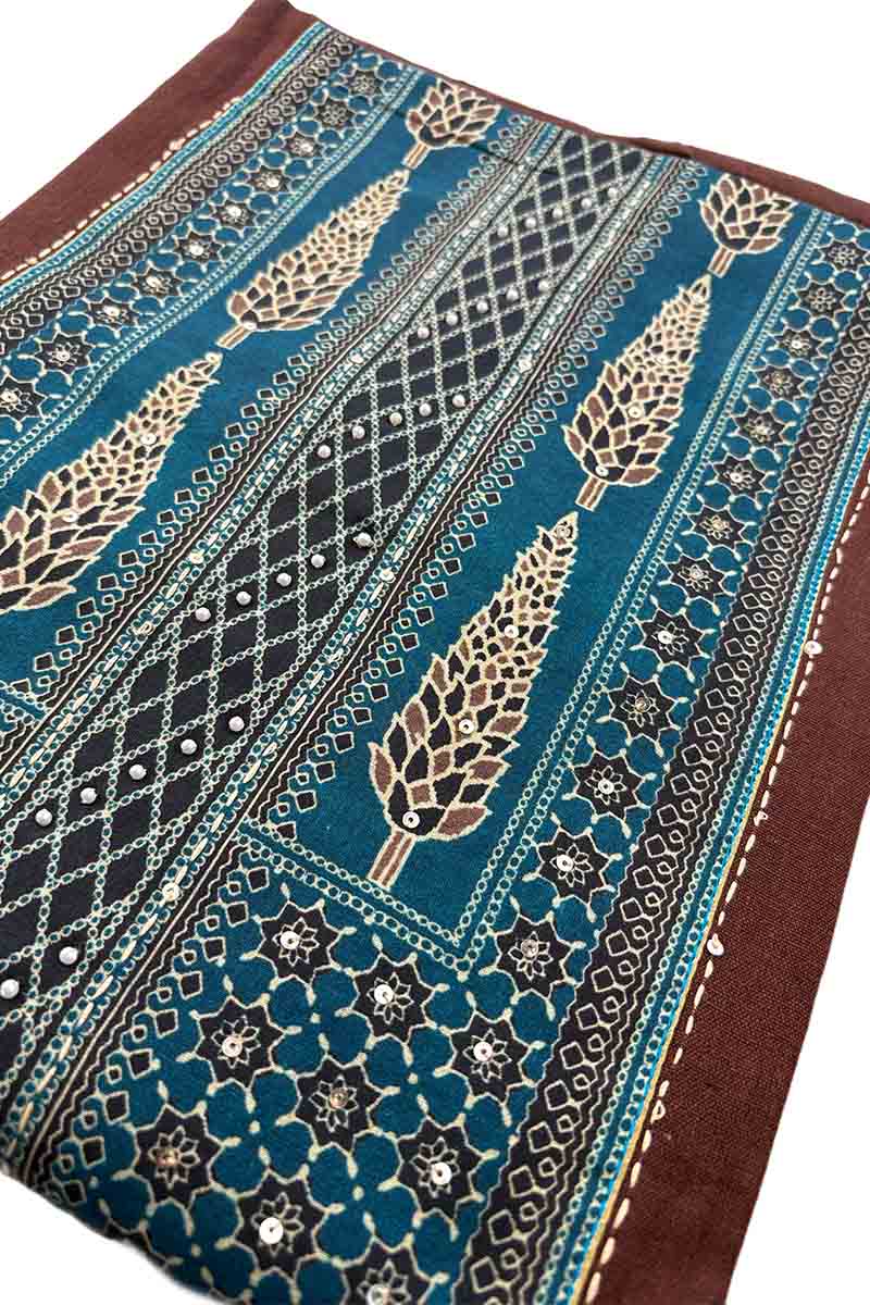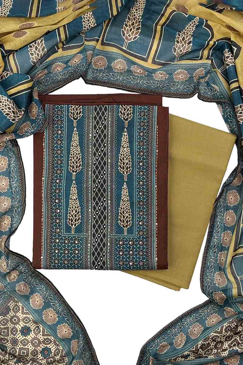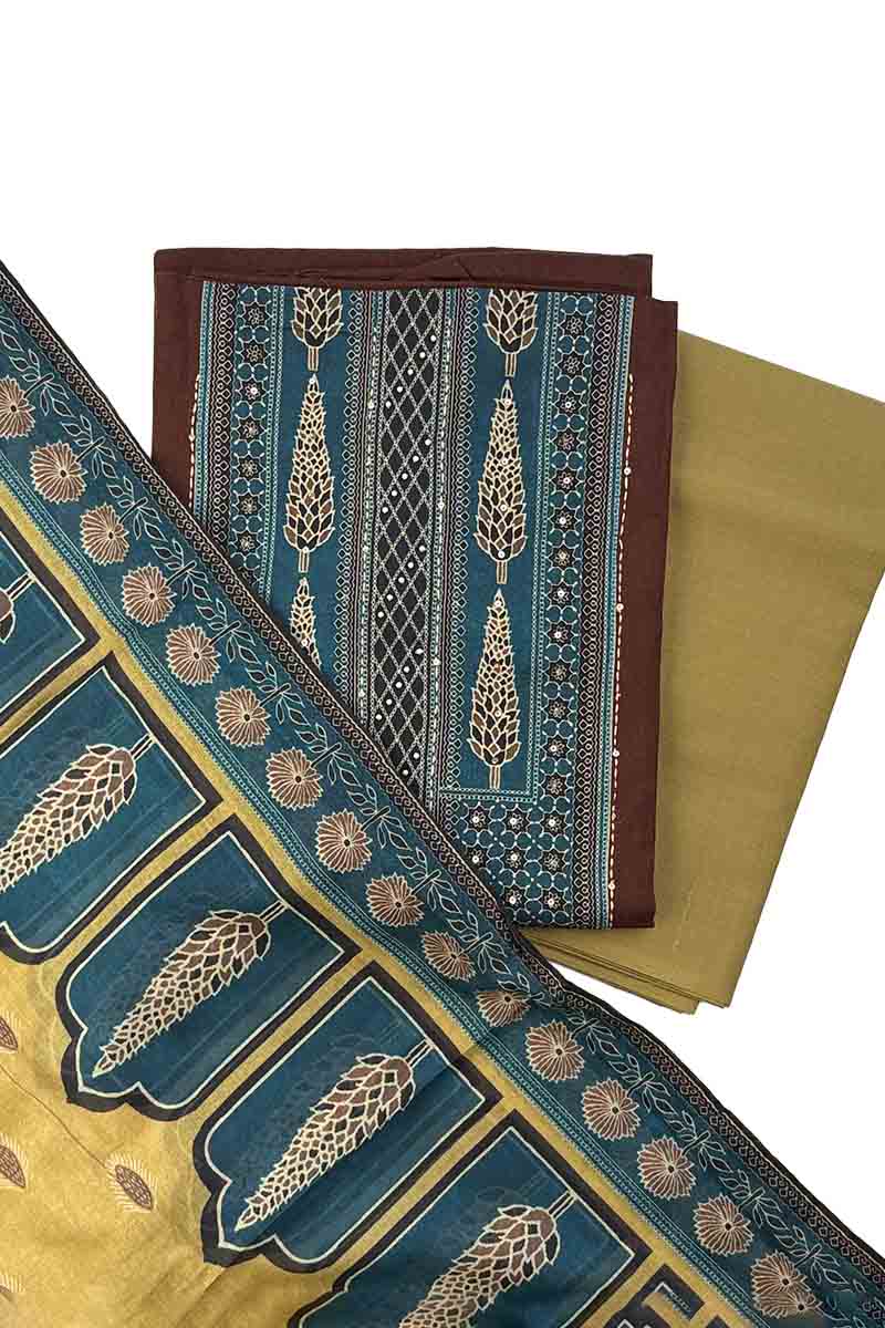 Premium Khadi Cotton Salwar Material (Top, Bottom & Dupatta) | Umber Brown + Teal Blue