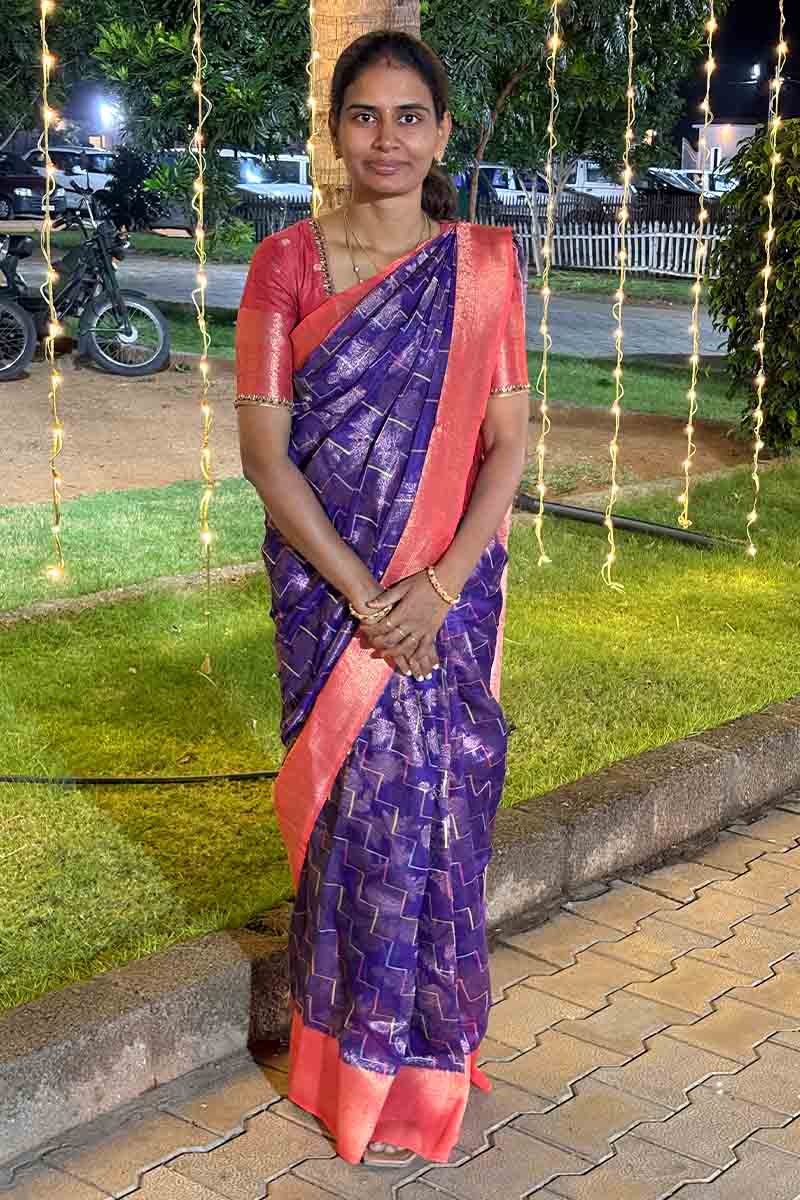 ✨ Banarasi Linen in Blue Violet + Tango Orange - Vibrant Chevron Stripes | Menmai Exclusive Saree 👑