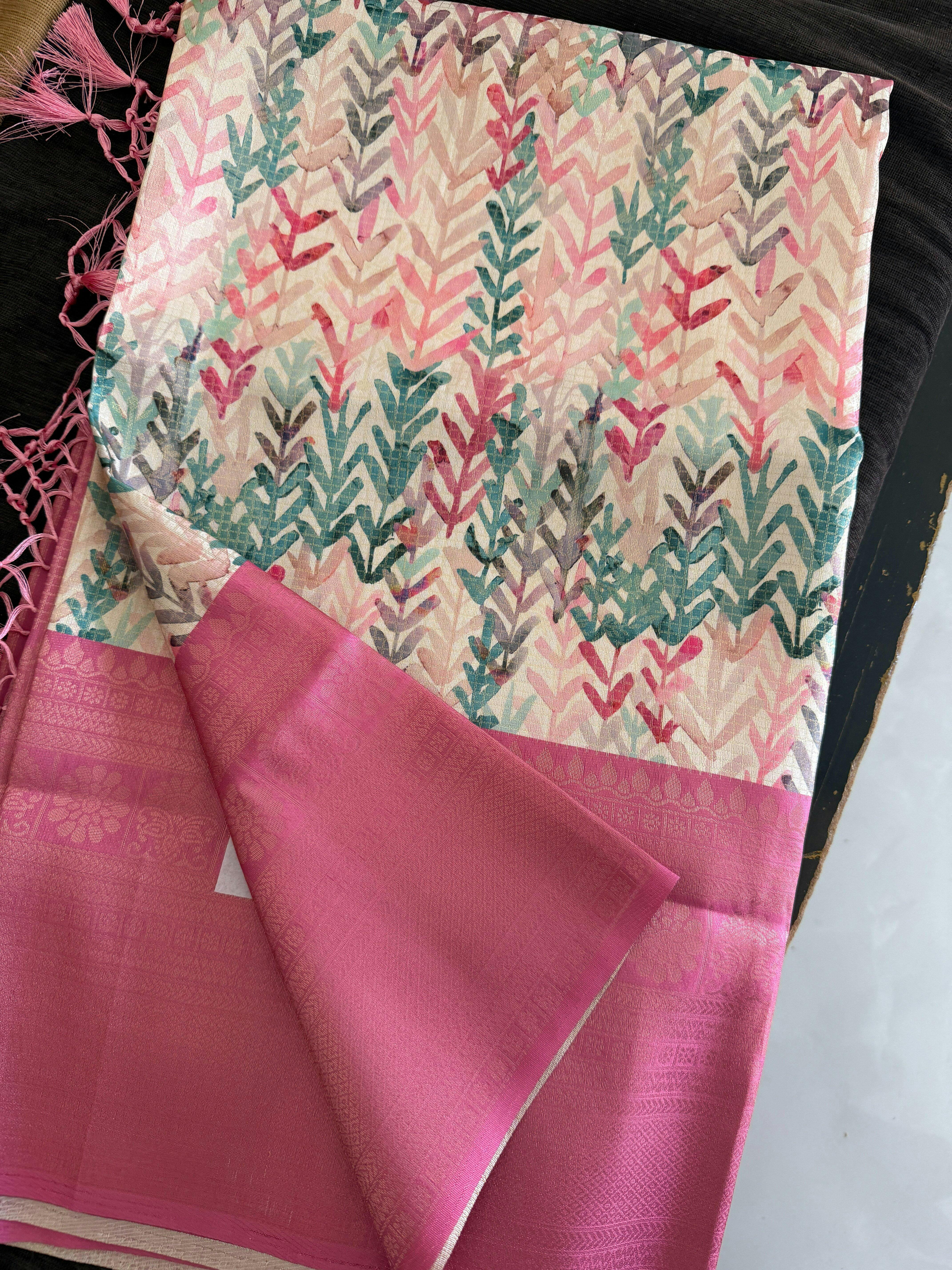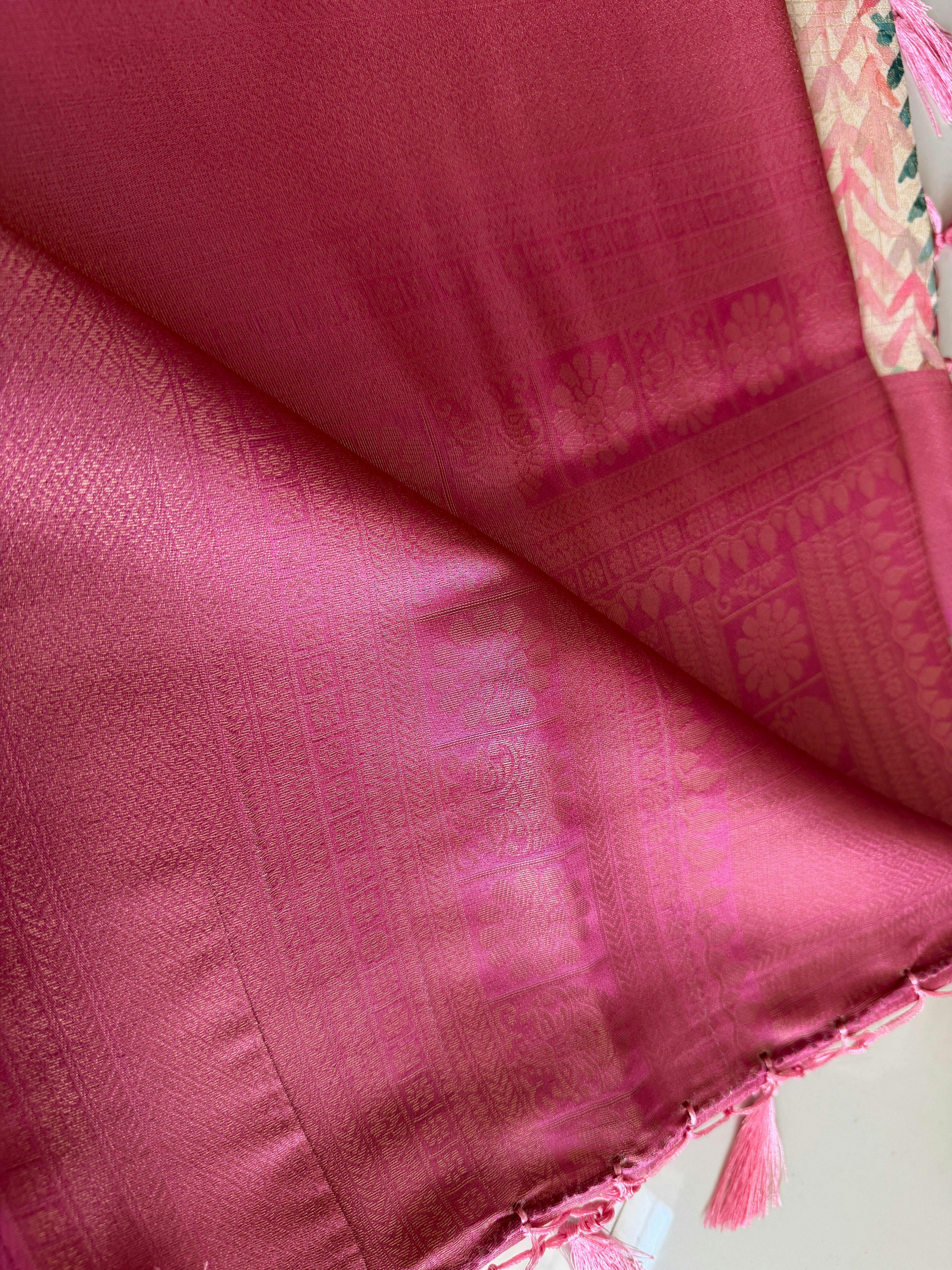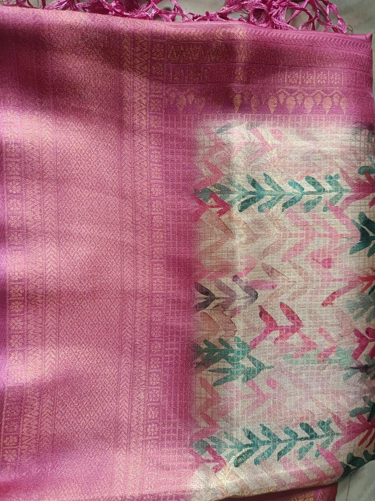 👑 Menmai Exclusive Leaf Pattern Tissue Silk Saree - Deep Rose