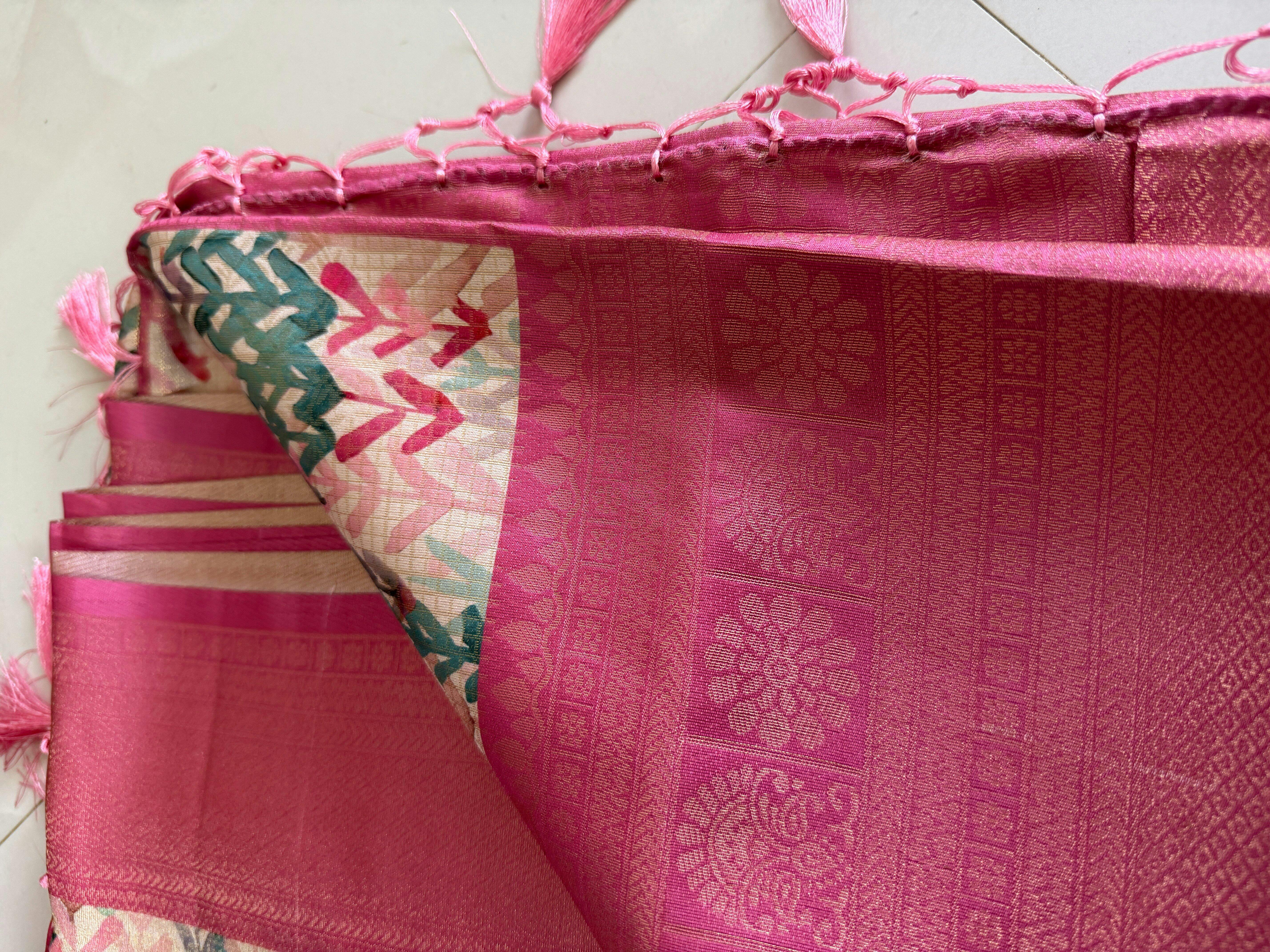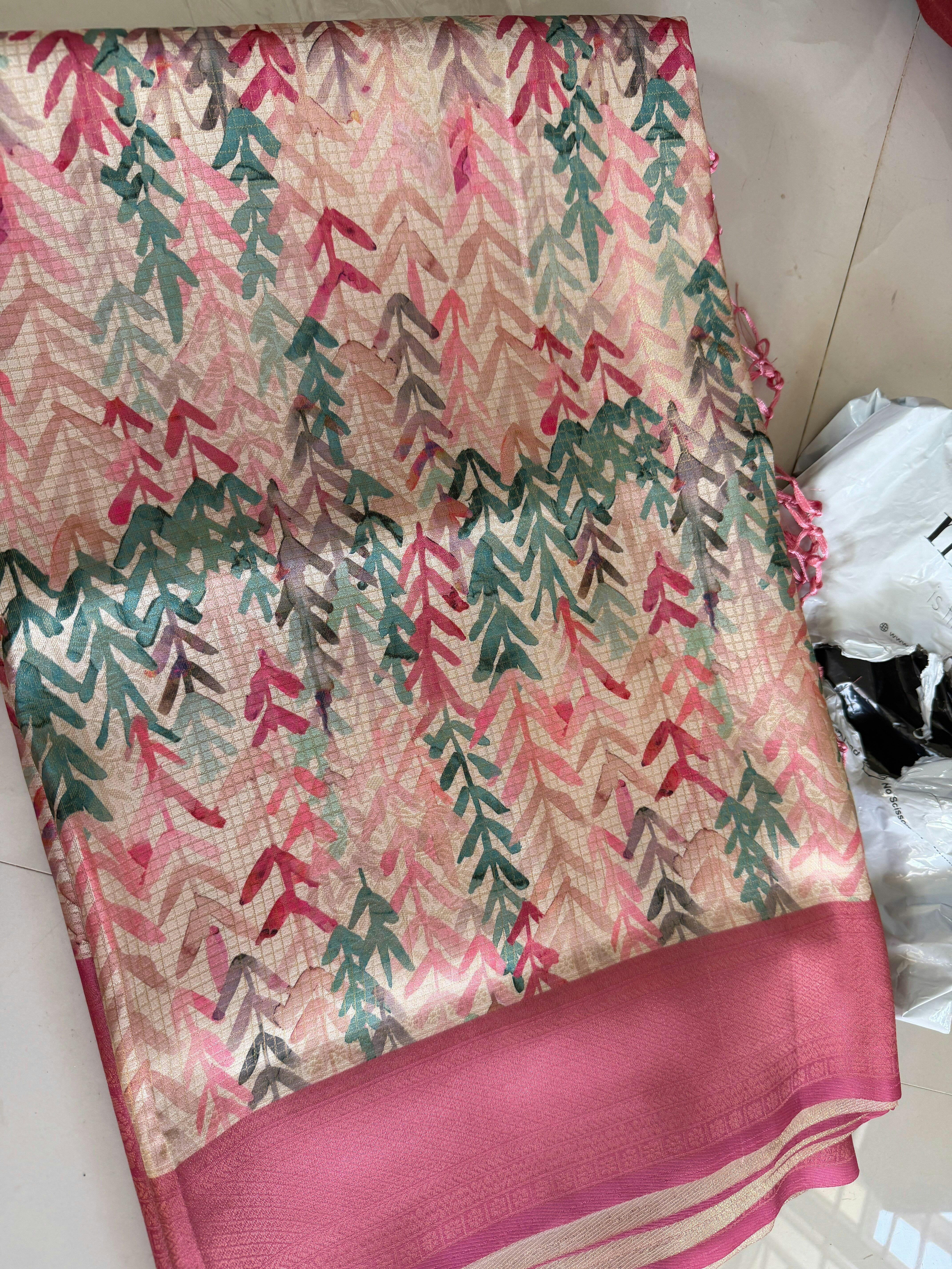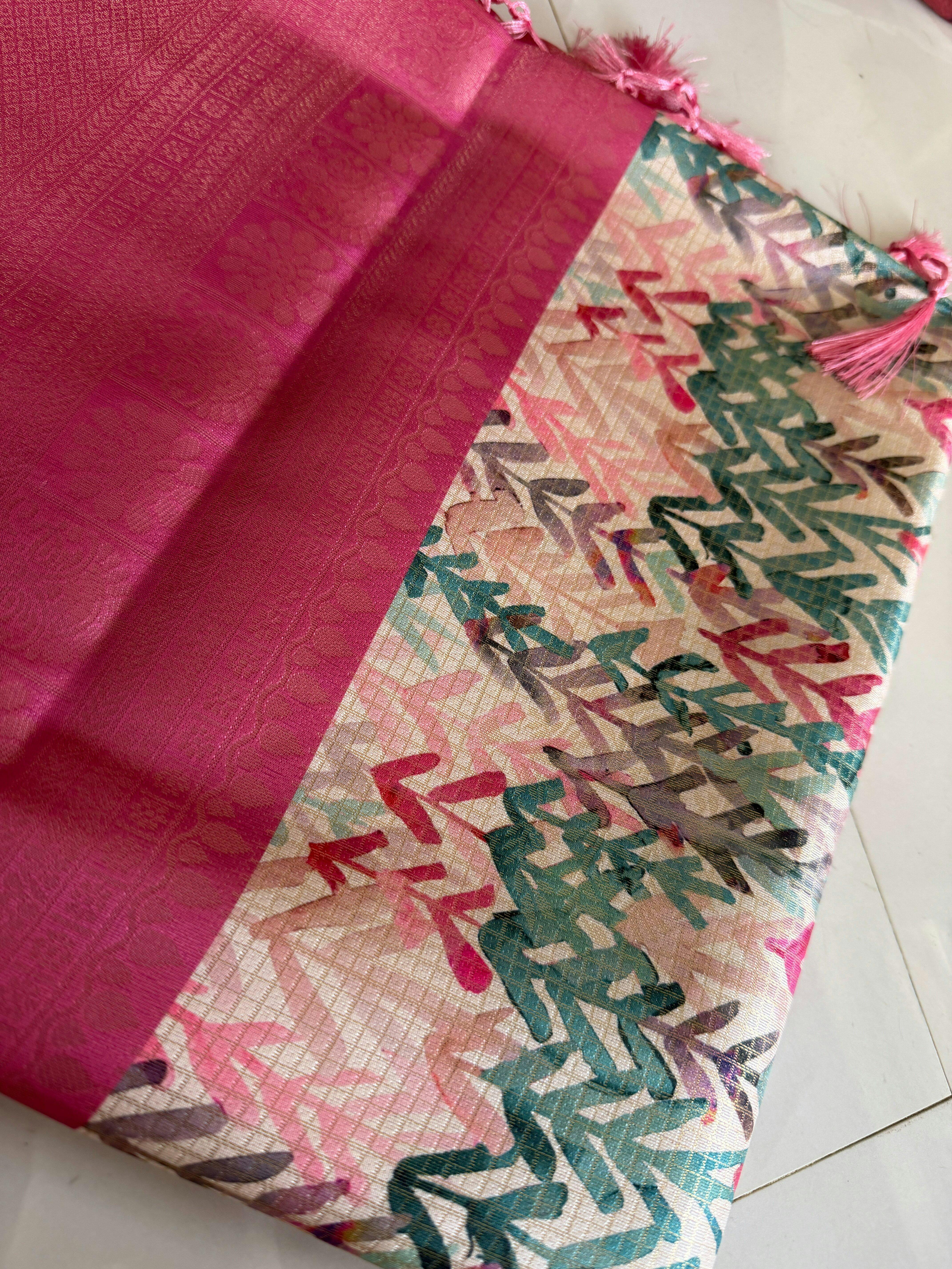 👑 Menmai Exclusive Leaf Pattern Tissue Silk Saree - Deep Rose