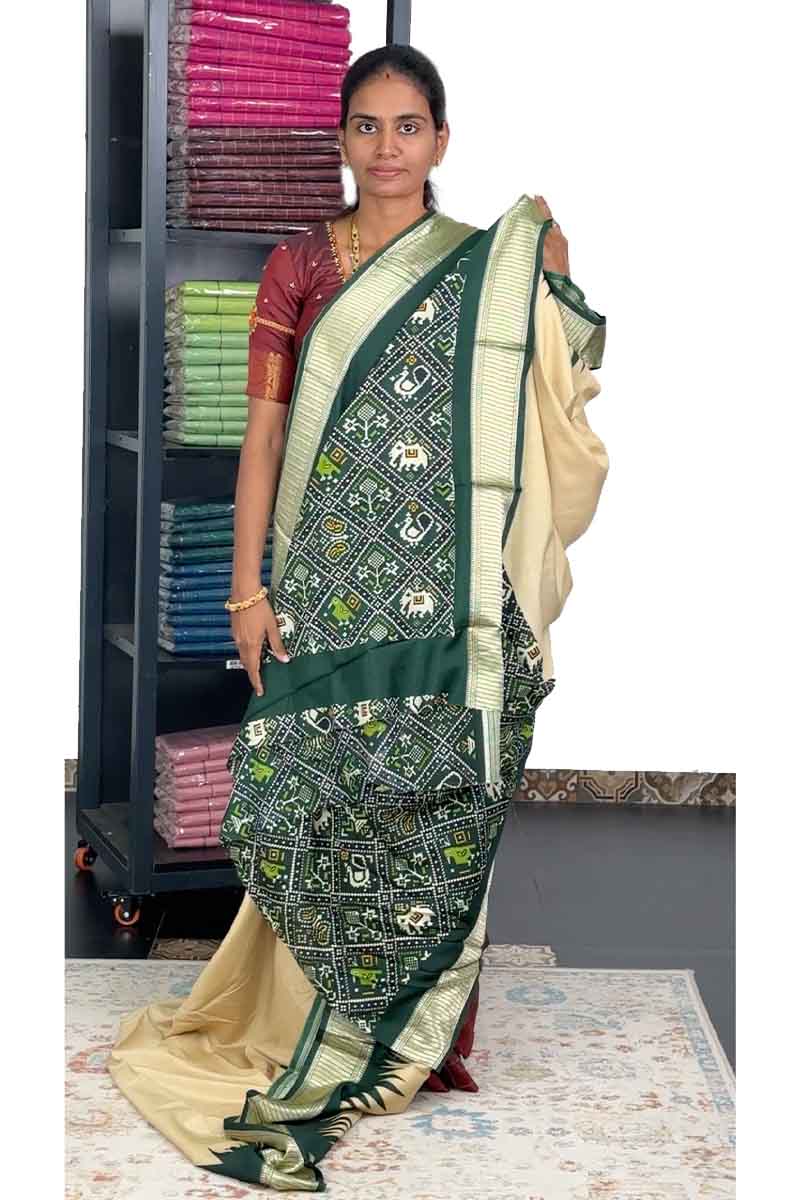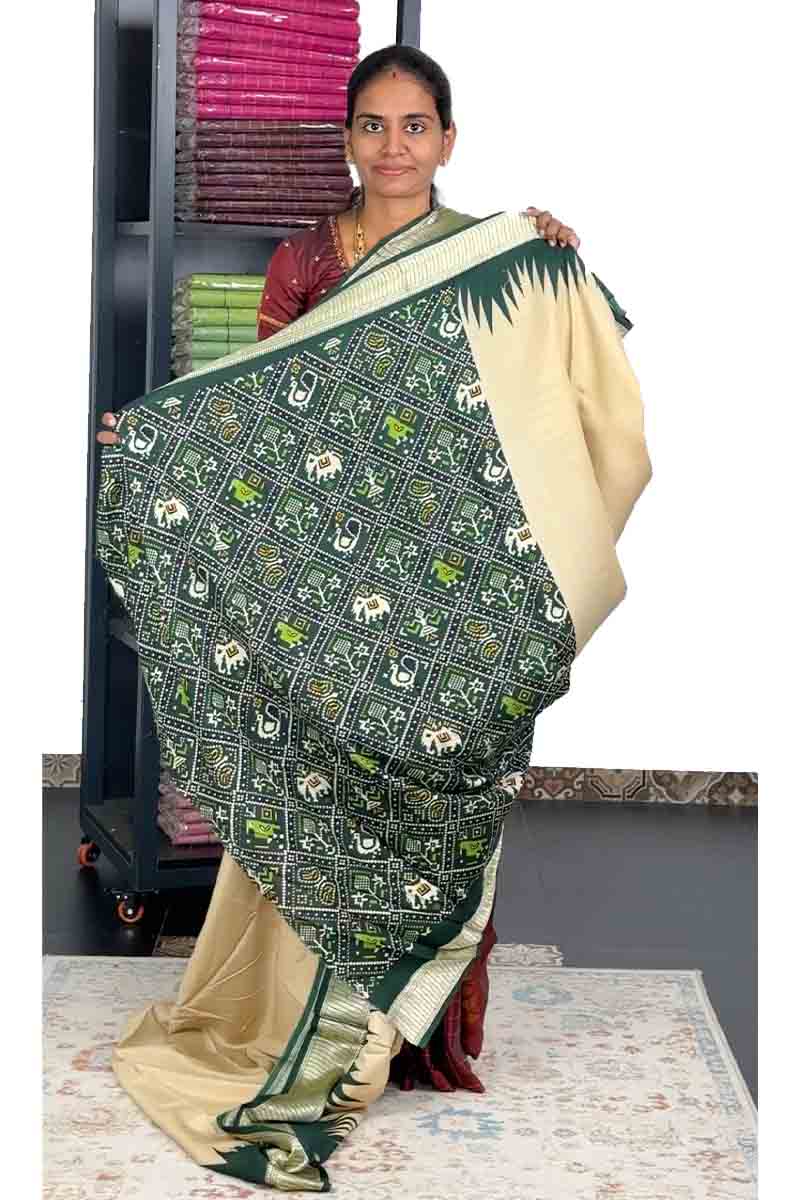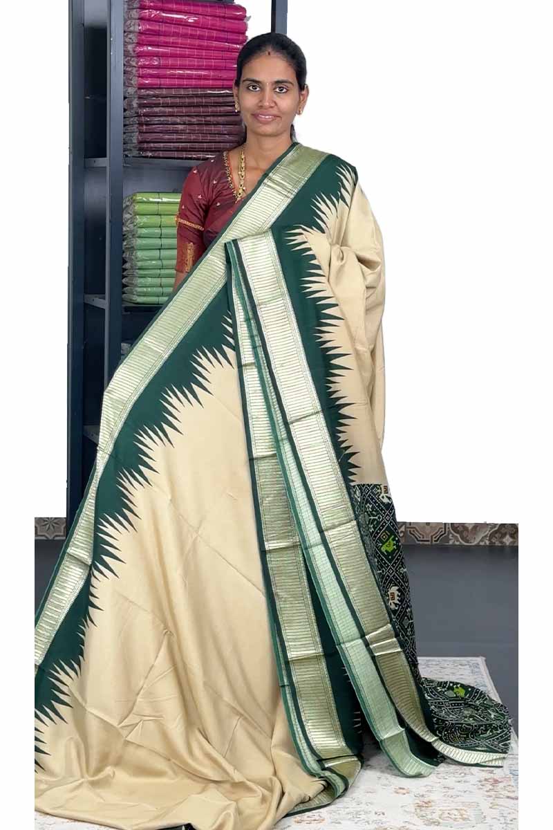 Viscose Dola Saree With Temple Border | Creme Colour+Forest Green