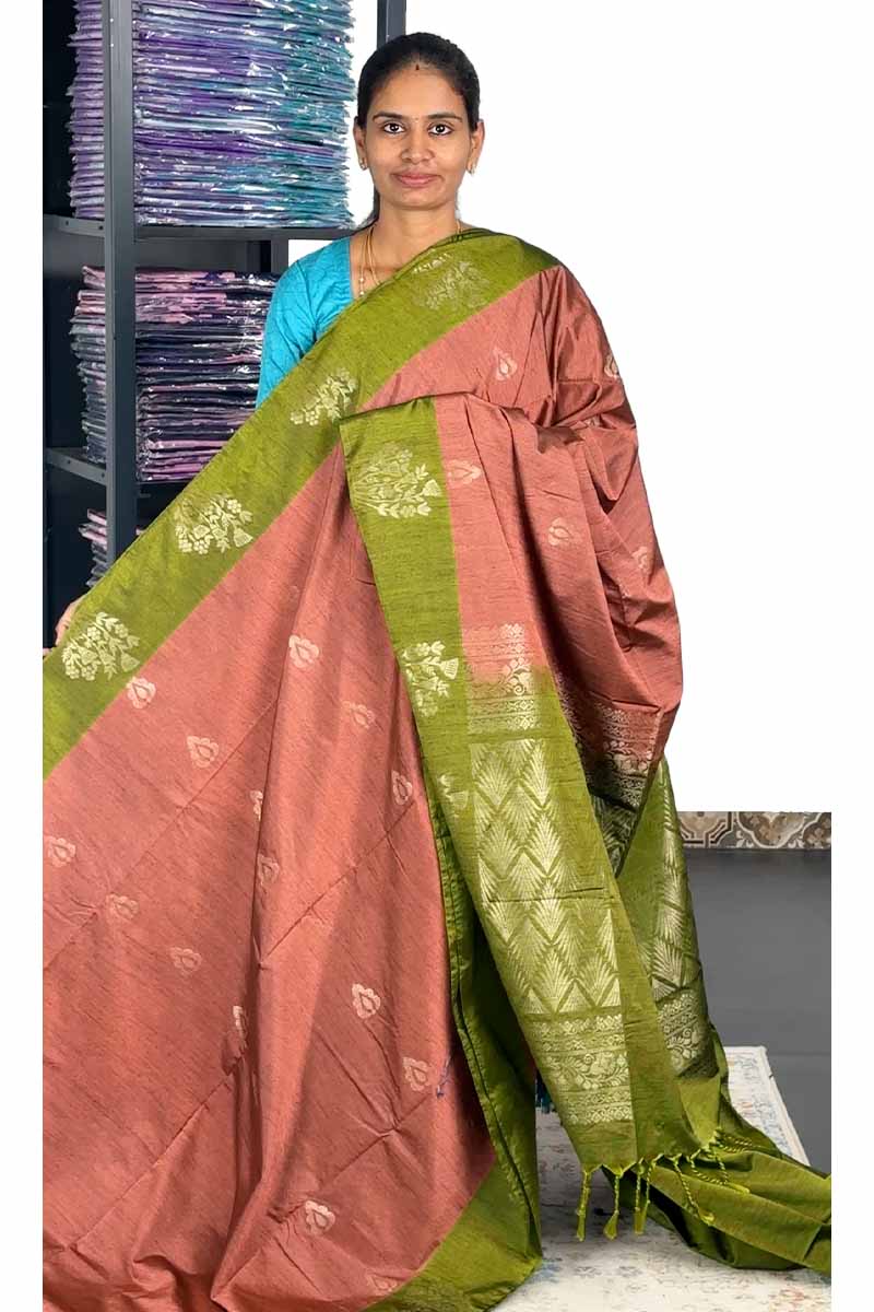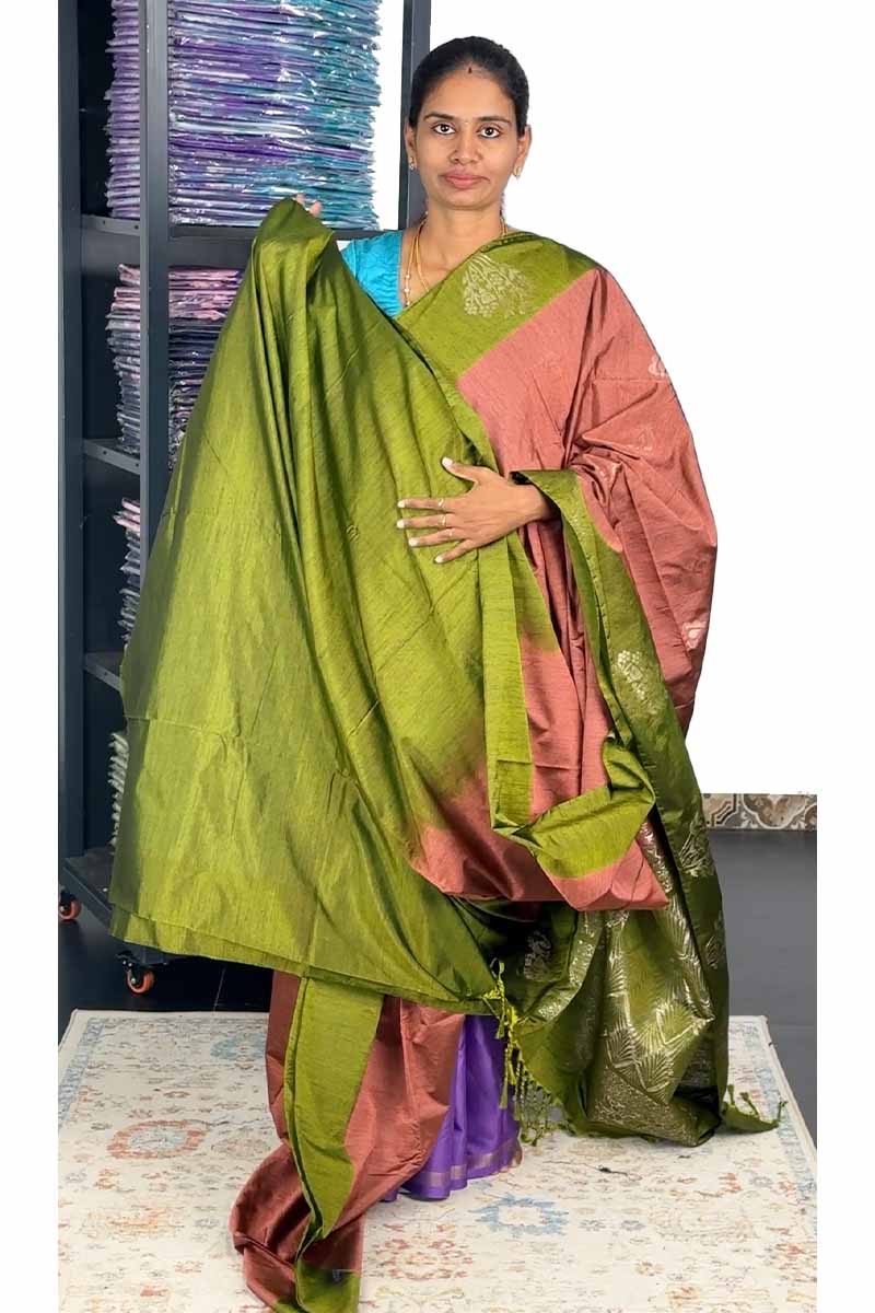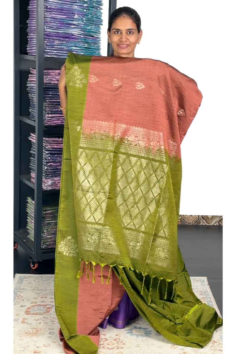 Jute Silk Mix Saree With Fancy Border | Peach + Olive Green
