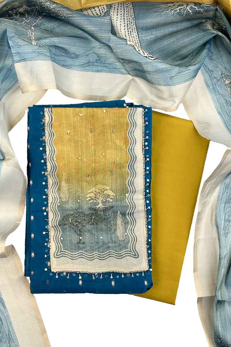 Here is our Royal Blue + Mustard Yellow colour unstitched dress material, which has an ideal fresh look.