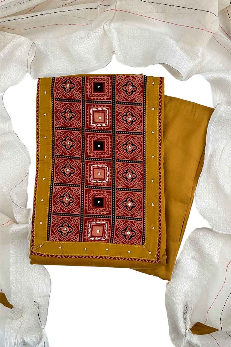 Here is our Dark Mustard + White unstitched dress material, which has an ideal fresh look.