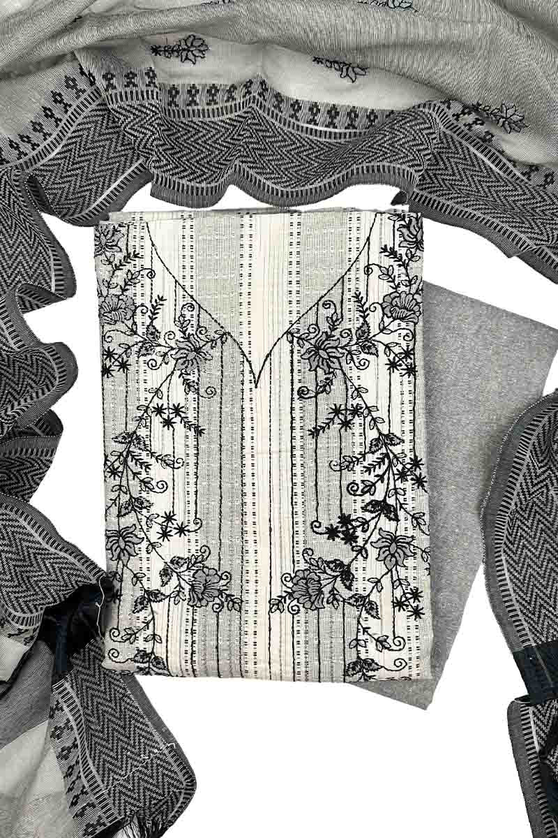 Here is our Grey + Half White unstitched dress material, which has an ideal fresh look.