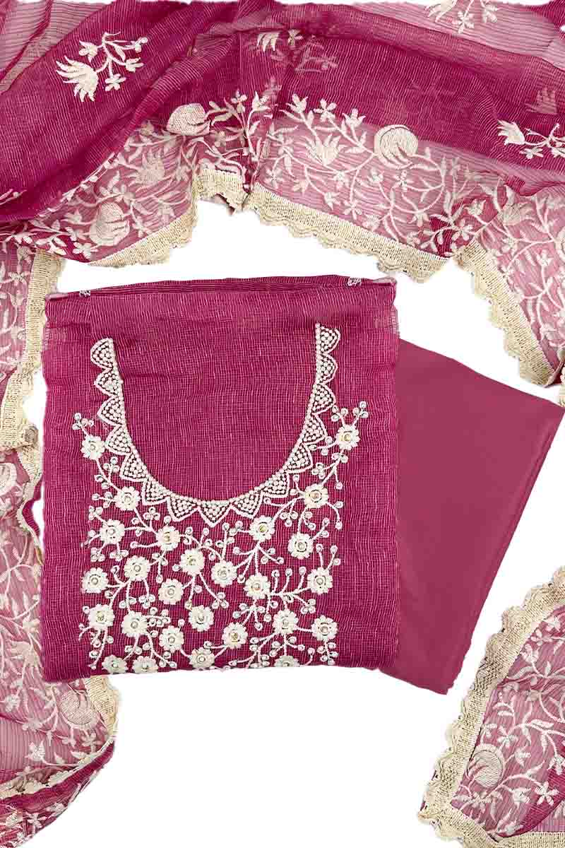 Unstitched Salwar Set - Kota Cotton with Floral Design | Fuschia Pink