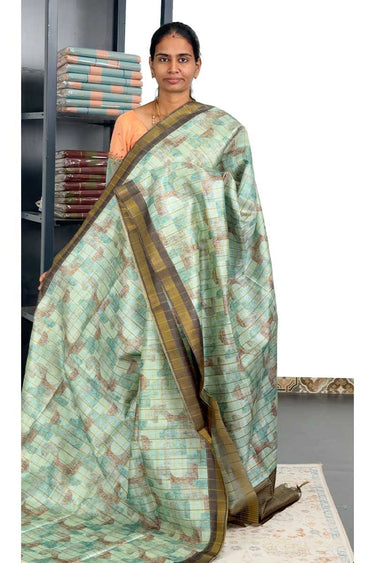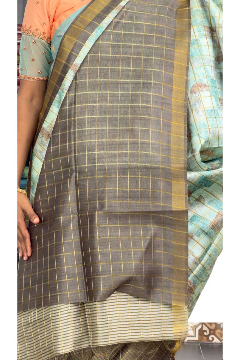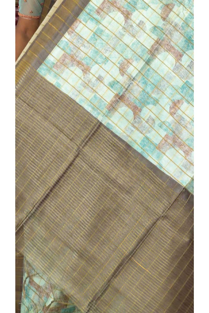 Art Tussar Saree with Chex | Celery Green + Soft Taupe
