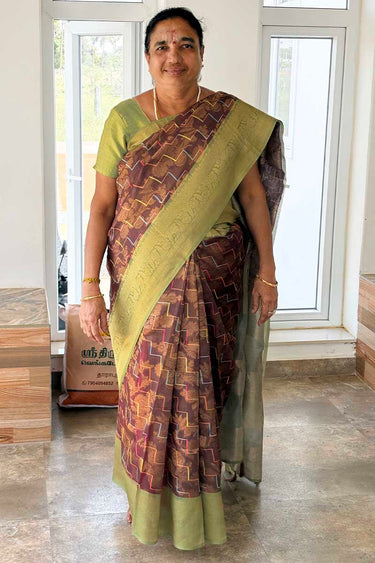✨ Banarasi Linen in Coffee Brown + Fresh Green - Vibrant Chevron Stripes | Menmai Exclusive Saree 👑