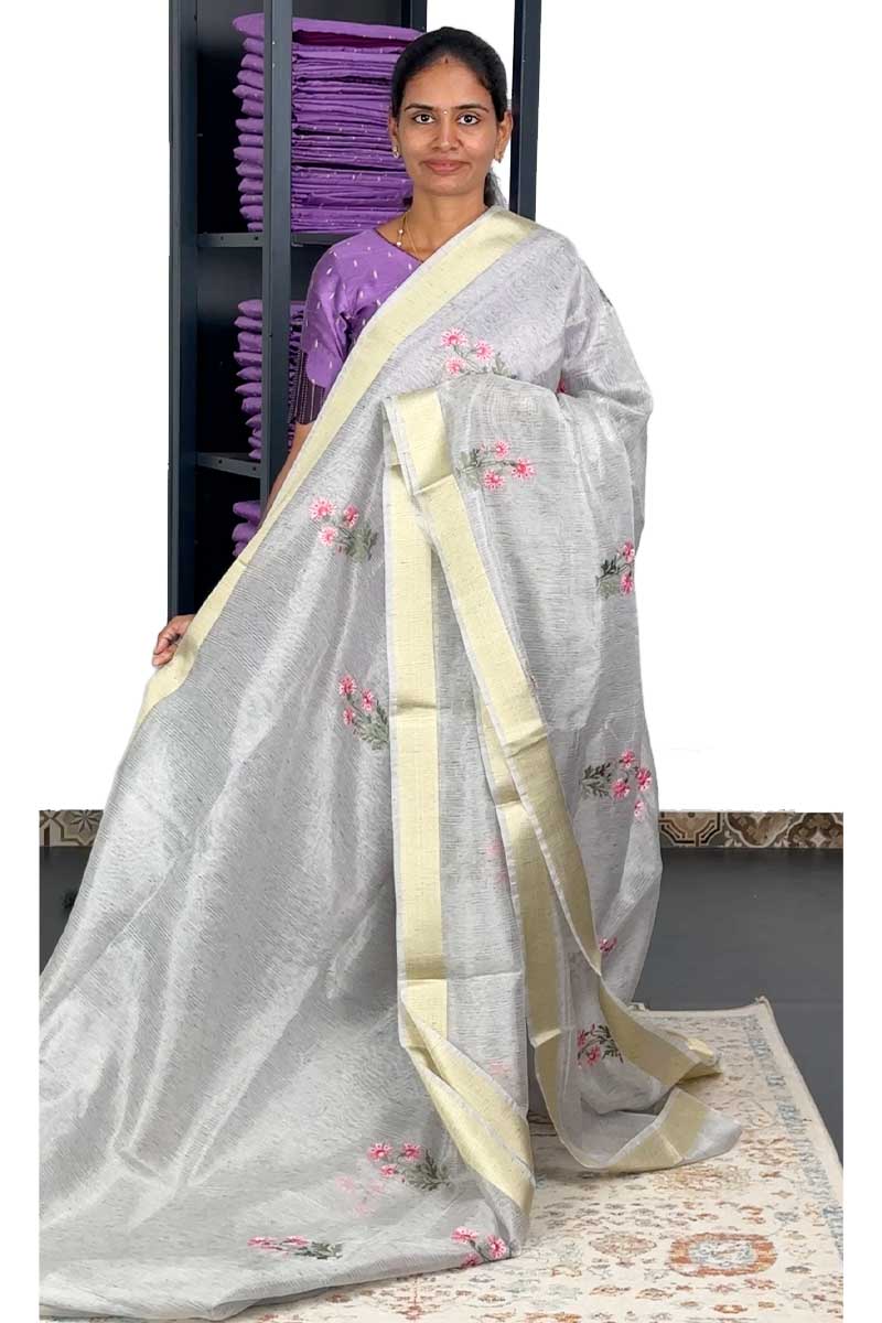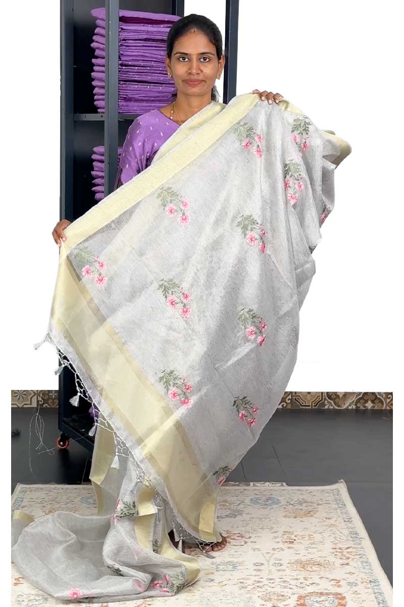Banarasi Linen Saree With Embroidery Motiff | Light Grey