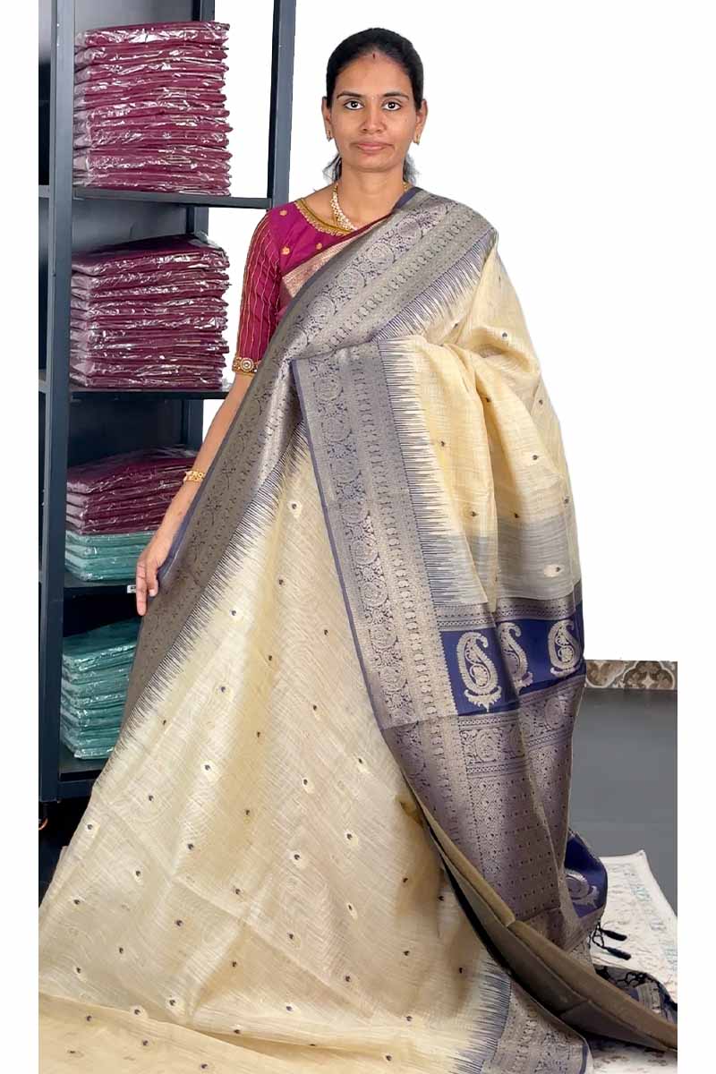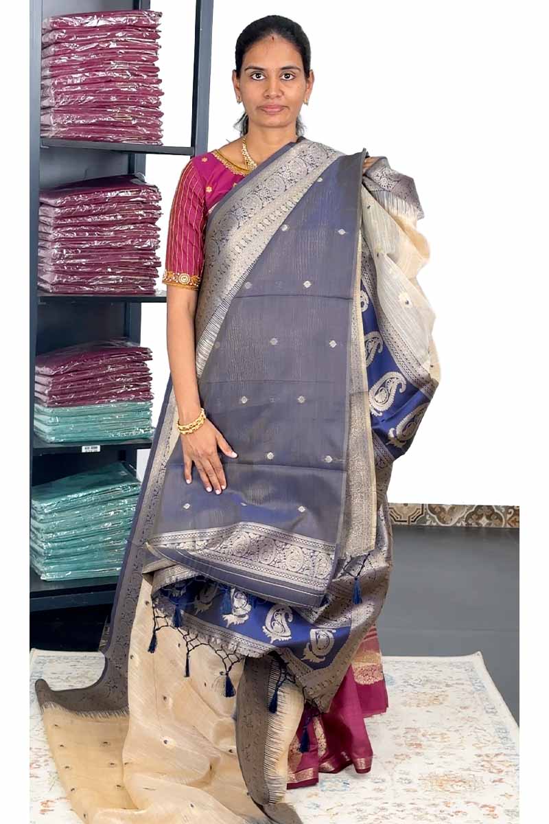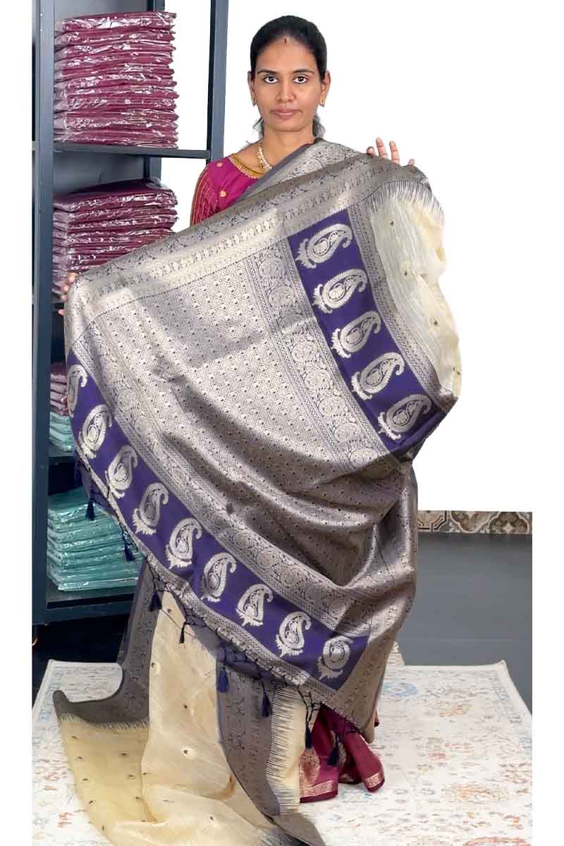 Banarasi Saree With Zari Weaving | Half White + Navy Blue