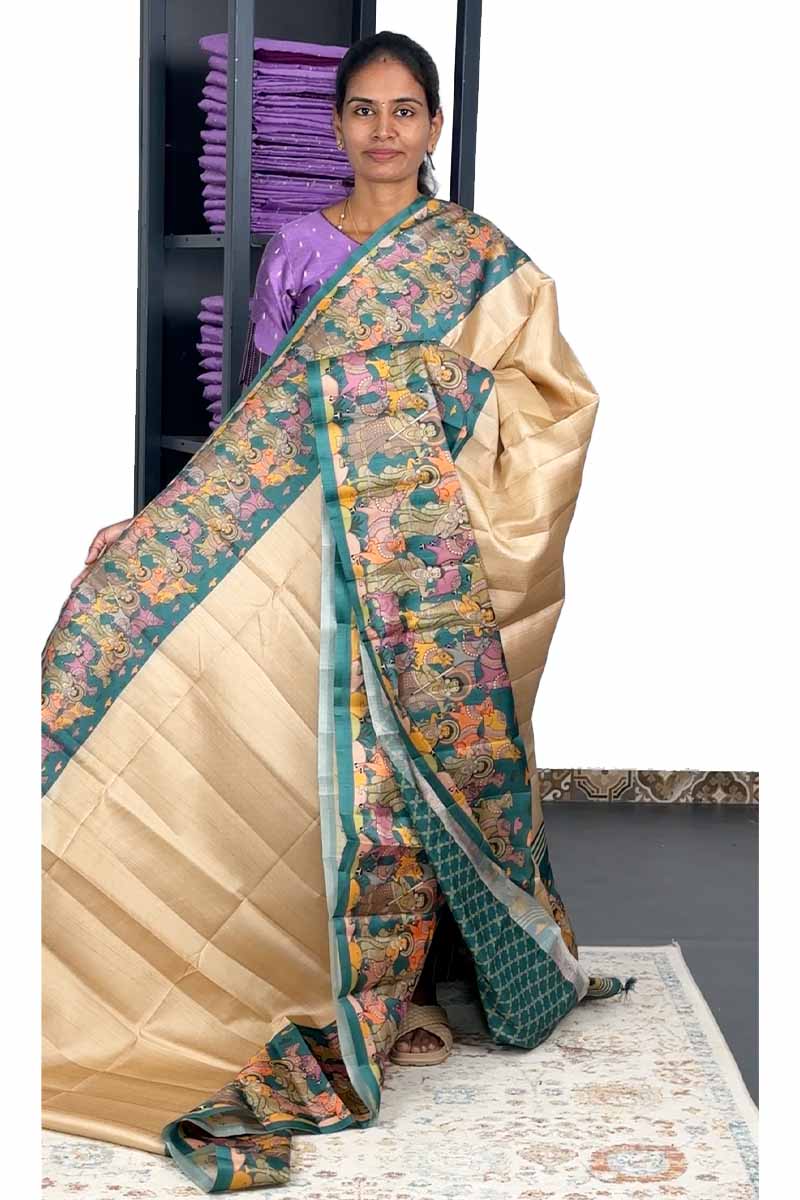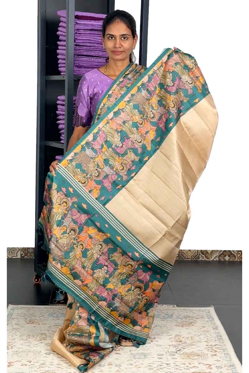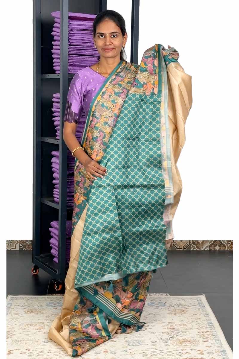 Butter Silk Saree with Pen Kalamkari design | Teal Blue + Tan White