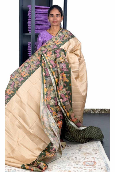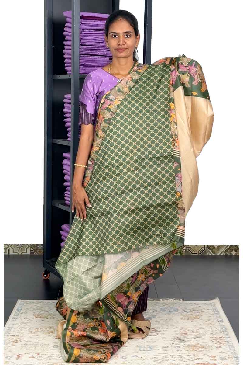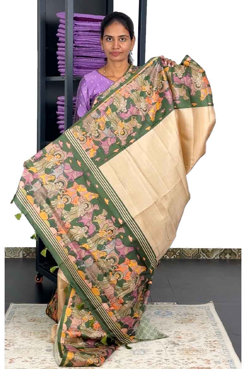 Butter Silk Saree with Pen Kalamkari design | Alpine Green + Tan White