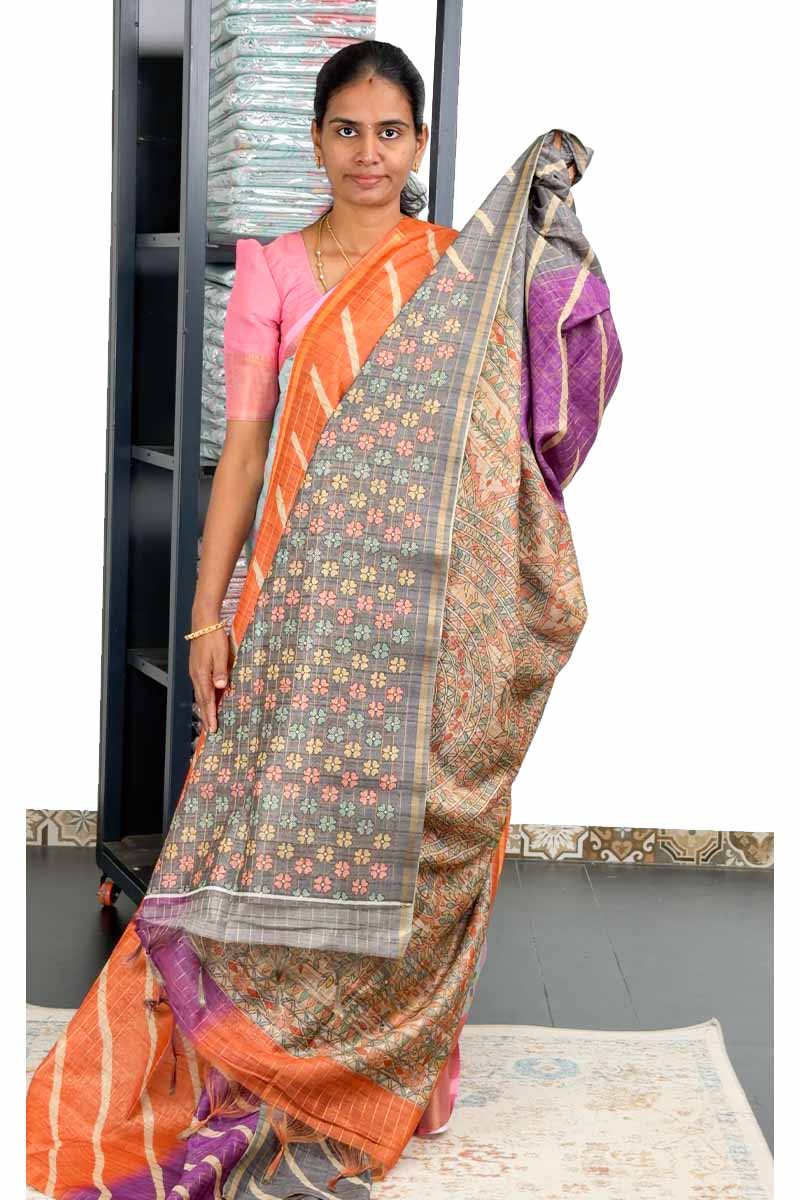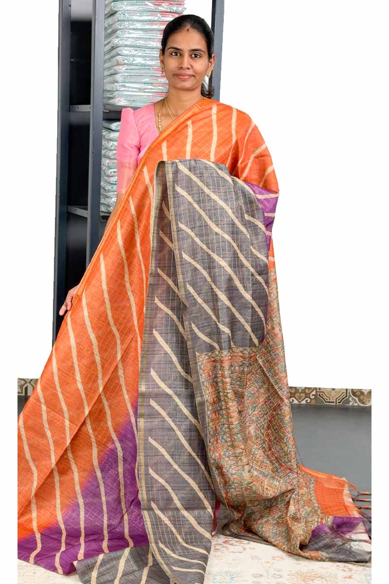 Chanderi Saree With Multi Colour | Pumpkin + Soft Taupe