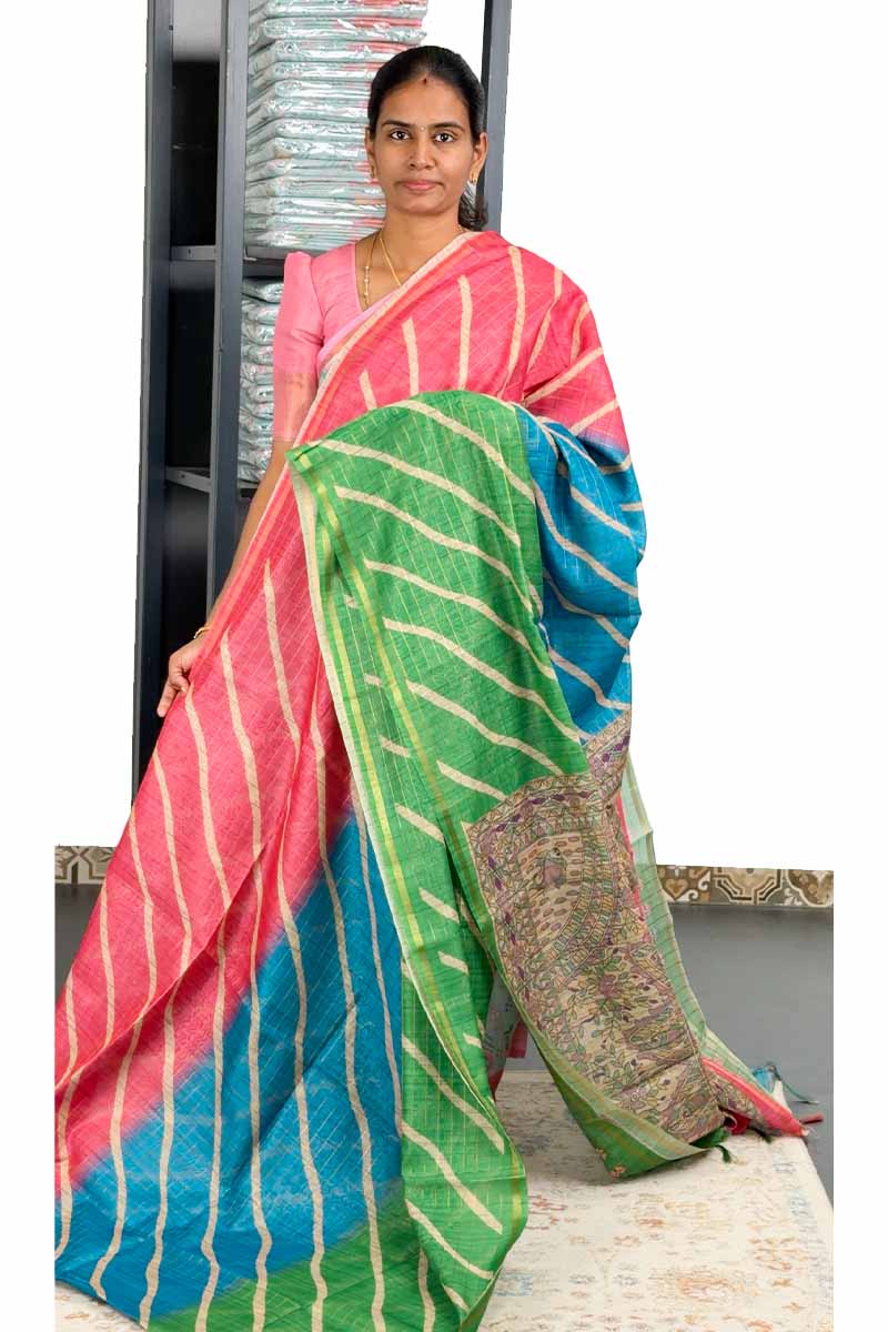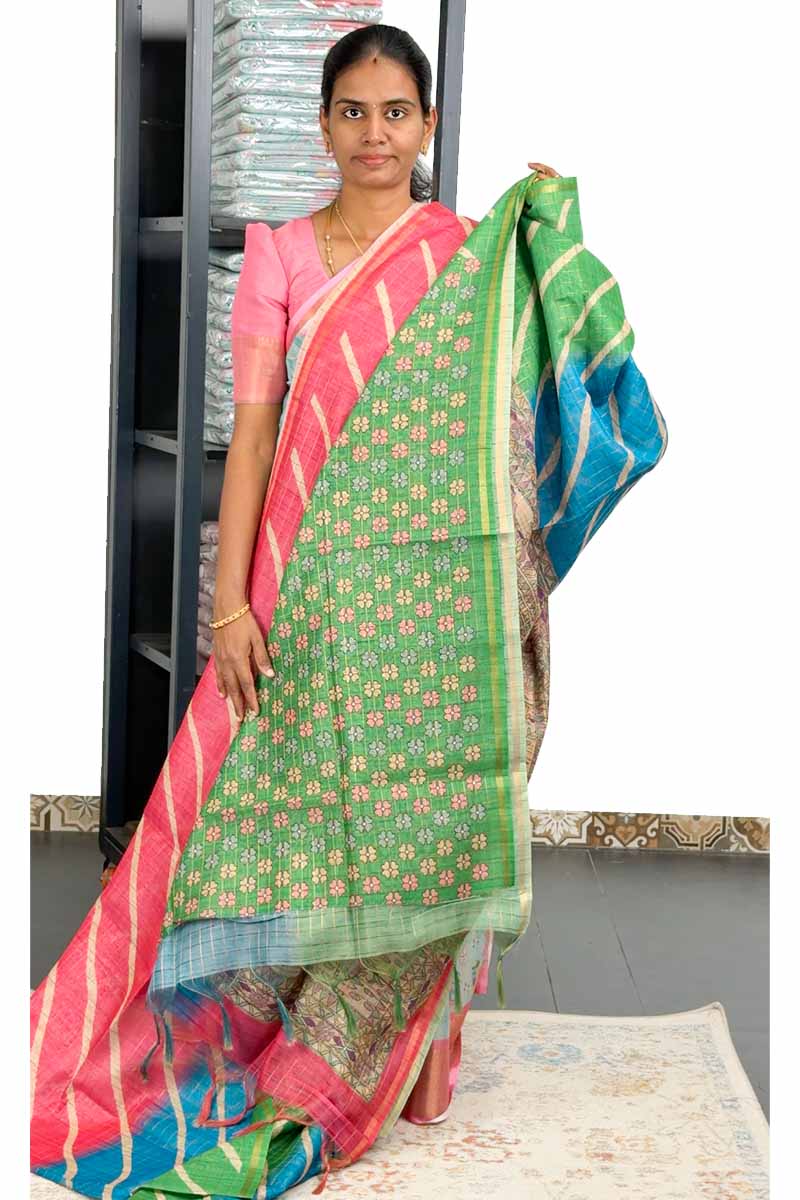 Chanderi Saree With Multi Colour | Mamey Pink + Emerald