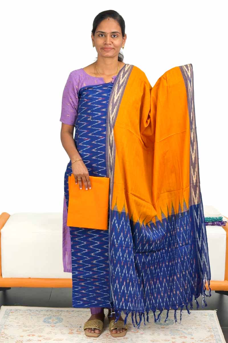 Cotton Salwar Material (Top, Bottom & Dupatta) | Navy Blue + Happy Orange