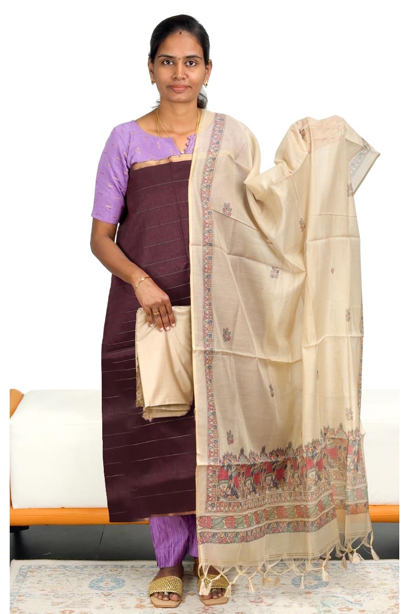 Dupion Silk Salwar Material (Top, Bottom & Dupatta) | Coffee Brown + Tussar