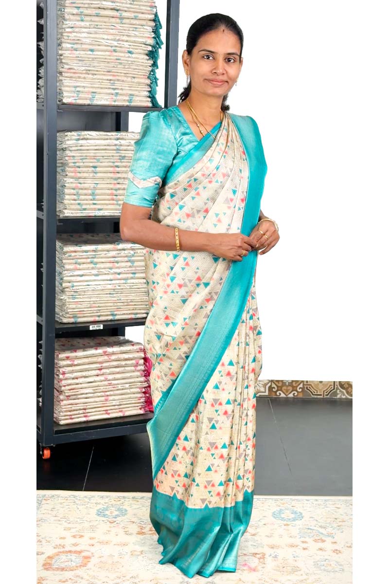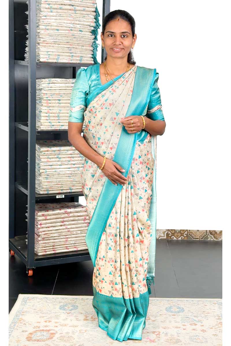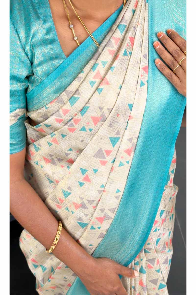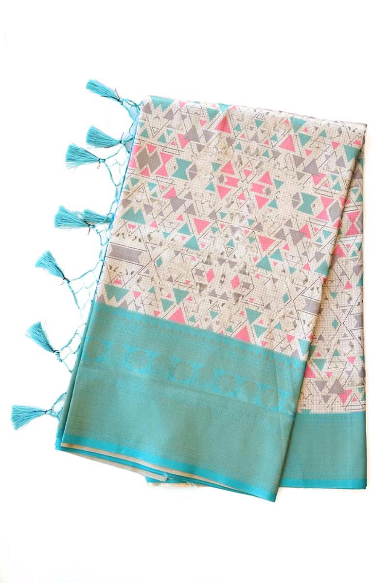 Geometric Pattern Digital Printed Tissue Silk Saree - Light blue