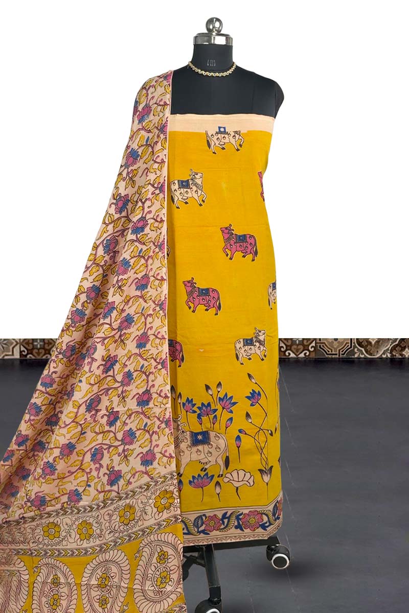 Kalamkari Cotton Salwar Material (Top & Dupatta) | Mustard Yellow + Cream Tan