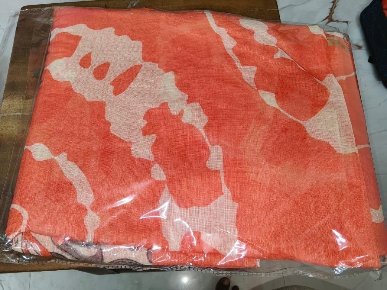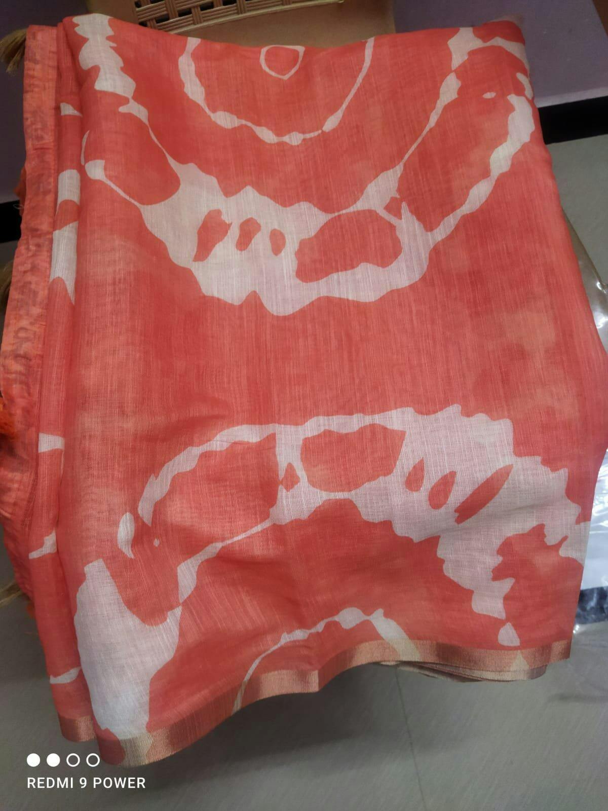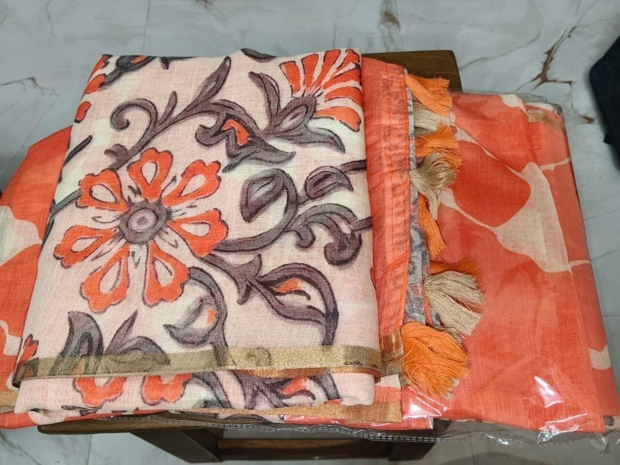 Linen Cotton Saree With Kalamakari Blouse | Tango Orange + Half White