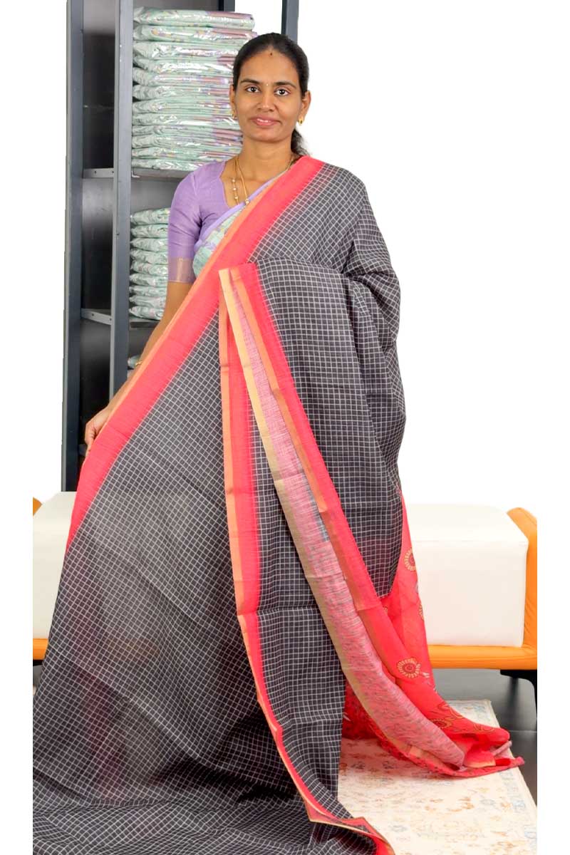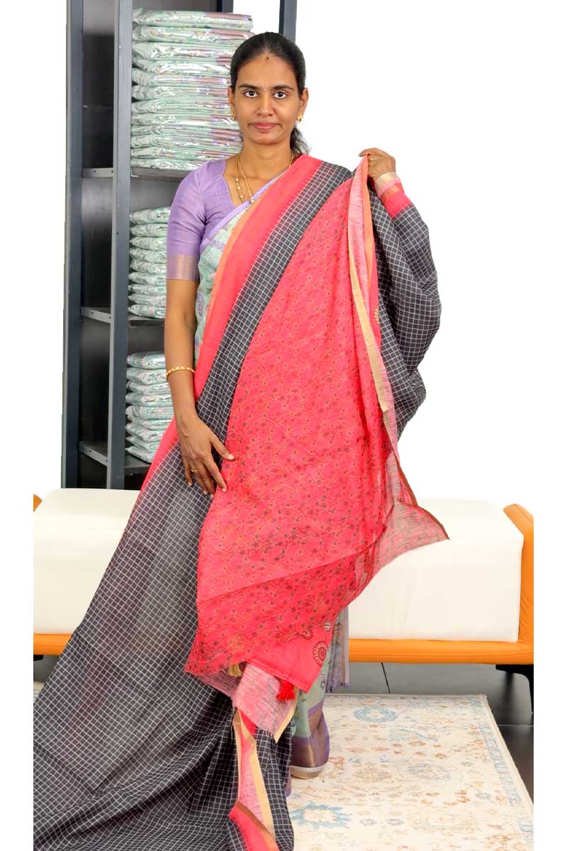 Linen Cotton Saree With Chex | Charcoal + Soft Red